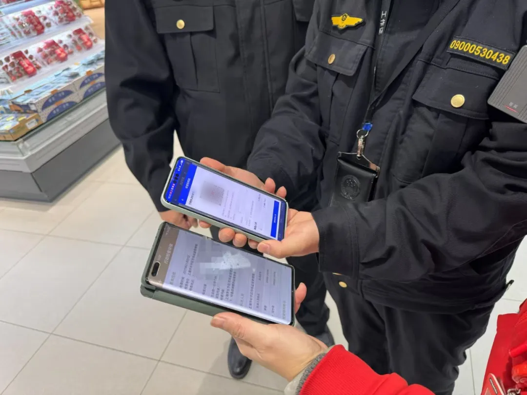 “您好,这是我们的执法证和本次检查的检查码,您可以通过‘随申办’APP扫描查询本次检查内容。”近日,临空园区市场监管所执法干部通过“市场监管”APP申领了长宁区首张“检查码”,并对辖区内的一家超市开展了首次“亮码检查”。