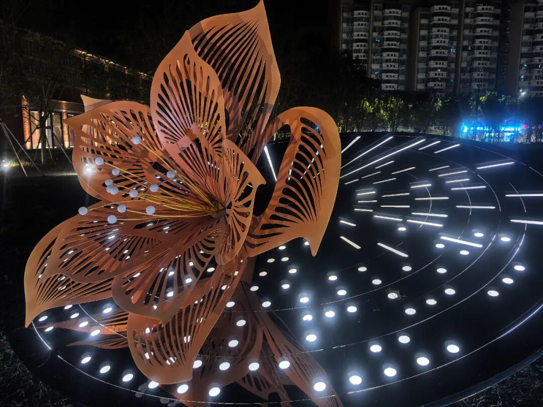 “多数装置采用可回收亚克力与再生钢材制作,最大限度减少资源消耗与环境影响。” 钟律表示,所有作品均兼顾白天与夜晚的观赏效果——白天是可触摸、可互动的公共艺术装置,夜晚则通过光影变幻呈现别样魅力,“我们刻意避免过度‘炫技’,让作品以温和的姿态融入空间,与周围环境和谐共生”。