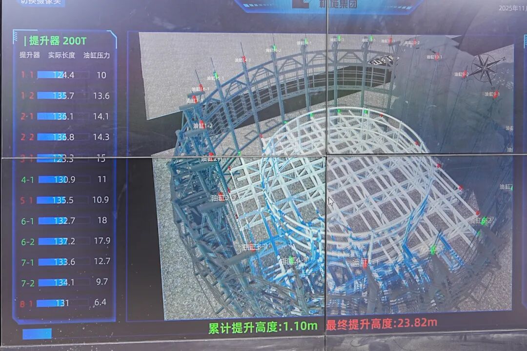 记者在现场看到,数十名工作人员正密切观测施工过程的动画模拟和数据监测,另有数百人散布在工地各处,全力推进各方面的建设工作。整体提升工程既是一项挑战,更是一项成就——一方面,吊装在主体操馆地上钢结构内进行,这是一个近百米的半球体,由半球形网壳结构与主体钢结构两个独立体系组成,对施工过程中的结构体系稳定性、临时支撑的搭建以及合龙精度控制都提出了极为严苛的要求;另一方面,通过地面拼装与同步提升的方式,既能大幅降低高空作业风险,也能极大地缩短工期。