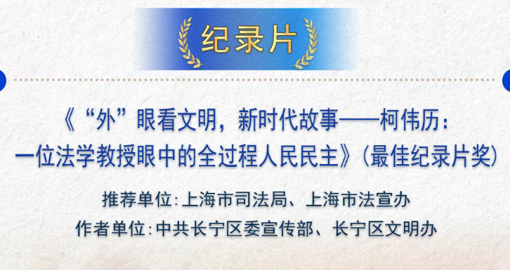 近日,由中宣部、中央网信办、司法部、全国普法办联合主办的第十九届全国法治动漫微视频作品征集展播活动结果揭晓。其中,由中共长宁区委宣传部、长宁区文明办制作的《“外”眼看文明,新时代故事——柯伟历:一位法学教授眼中的全过程人民民主》从1760余件作品中脱颖而出,荣获最佳纪录片奖,同时也是上海唯一一部纪录片类最佳单项作品。