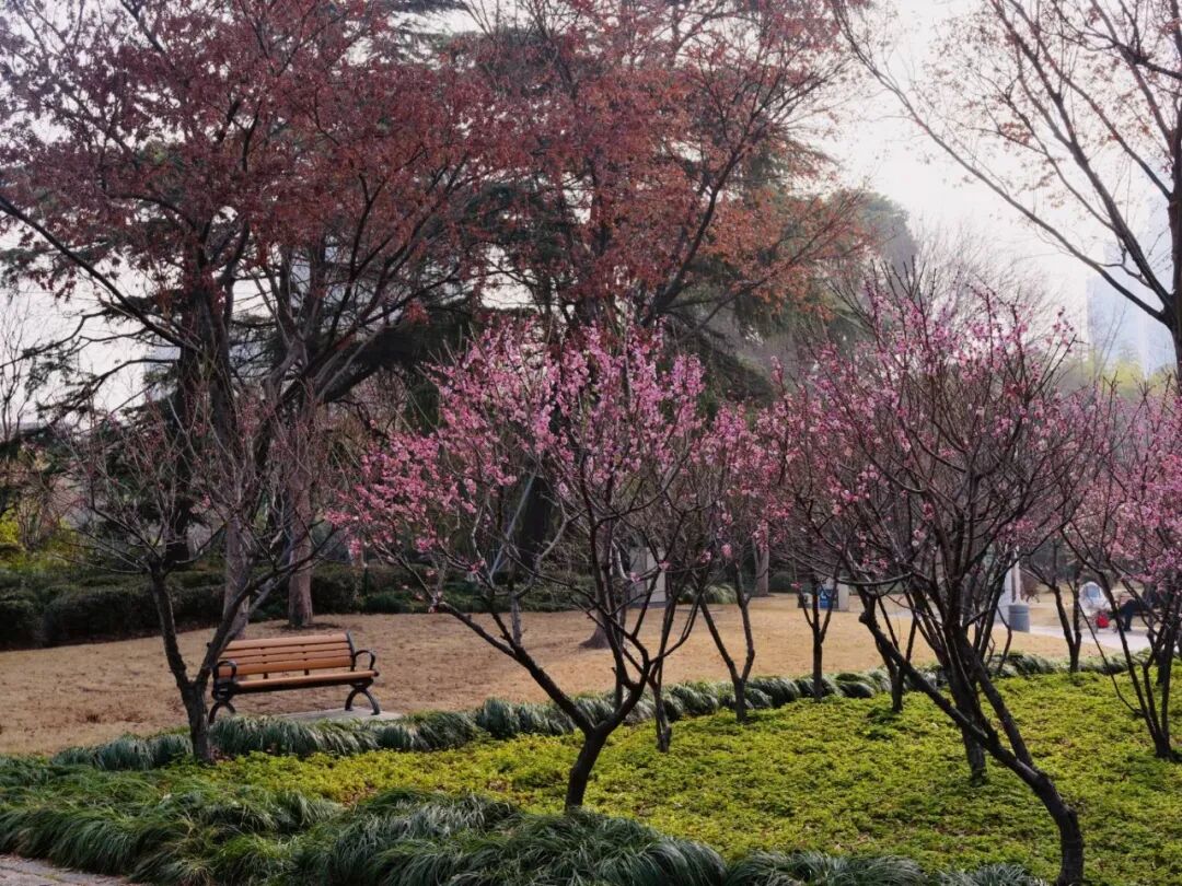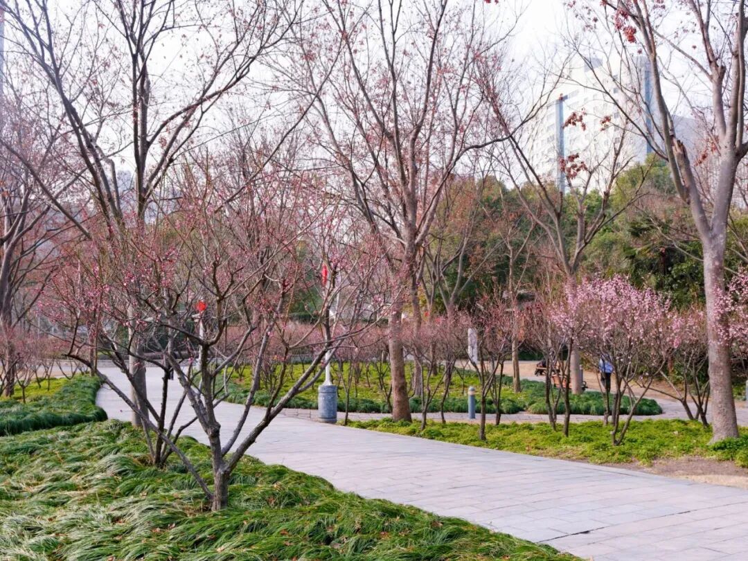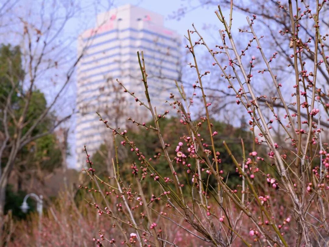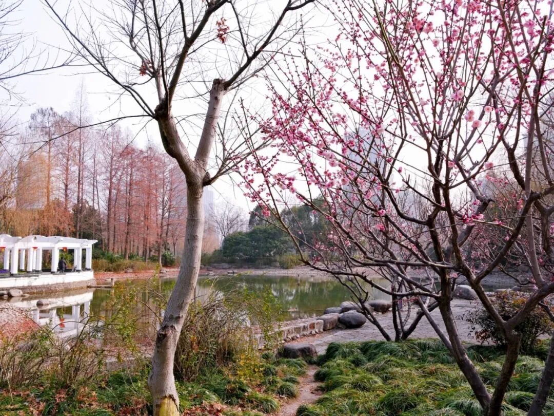 步入园中,横斜的梅枝间,嫣红、粉白的花朵密密匝匝,如云似雪,与蜿蜒步道、宁静池水相映成趣。远处高楼轮廓隐约可见,都市繁华与园内静谧在此交融,让人恍然置身“城市绿肺”。