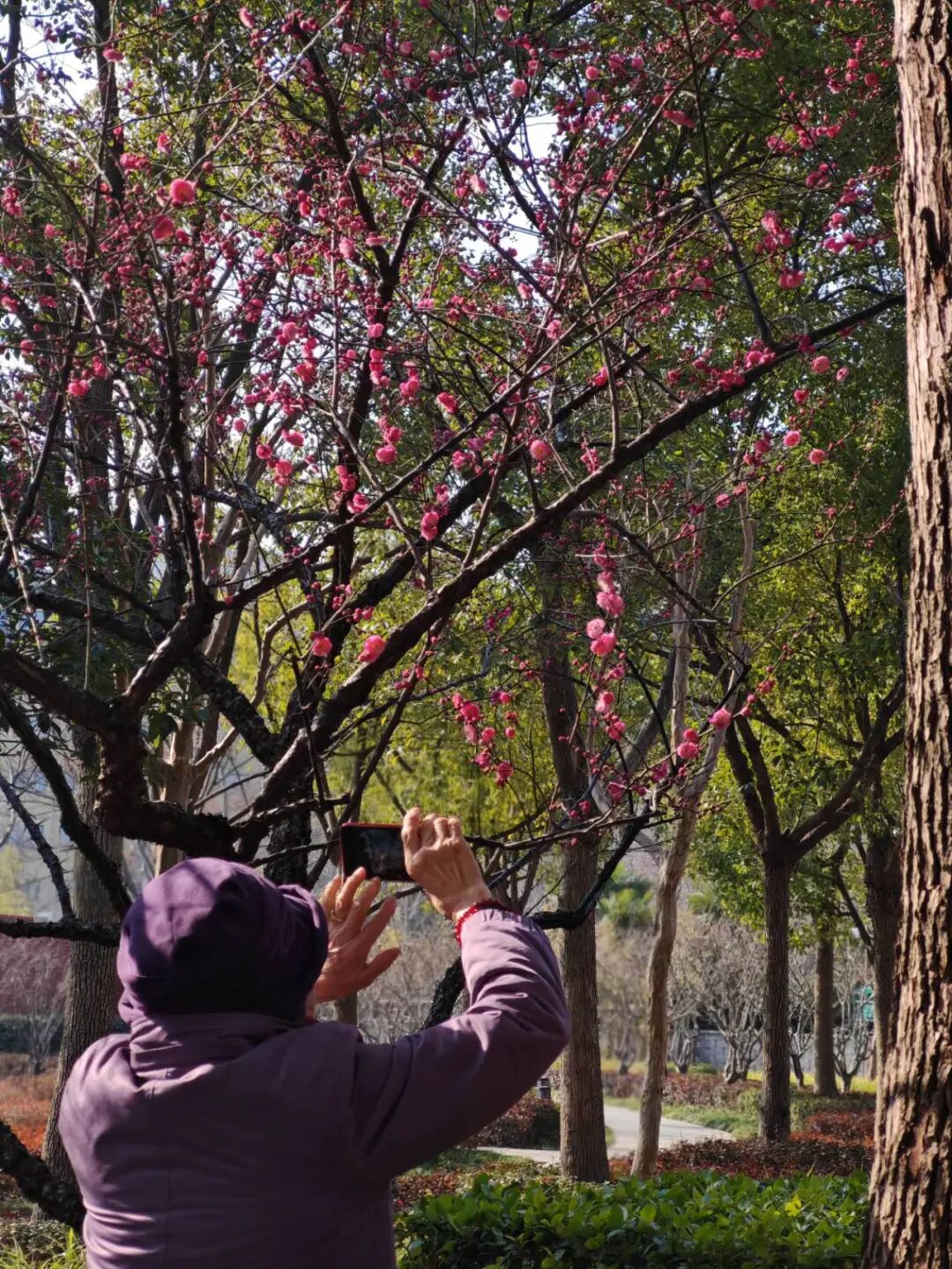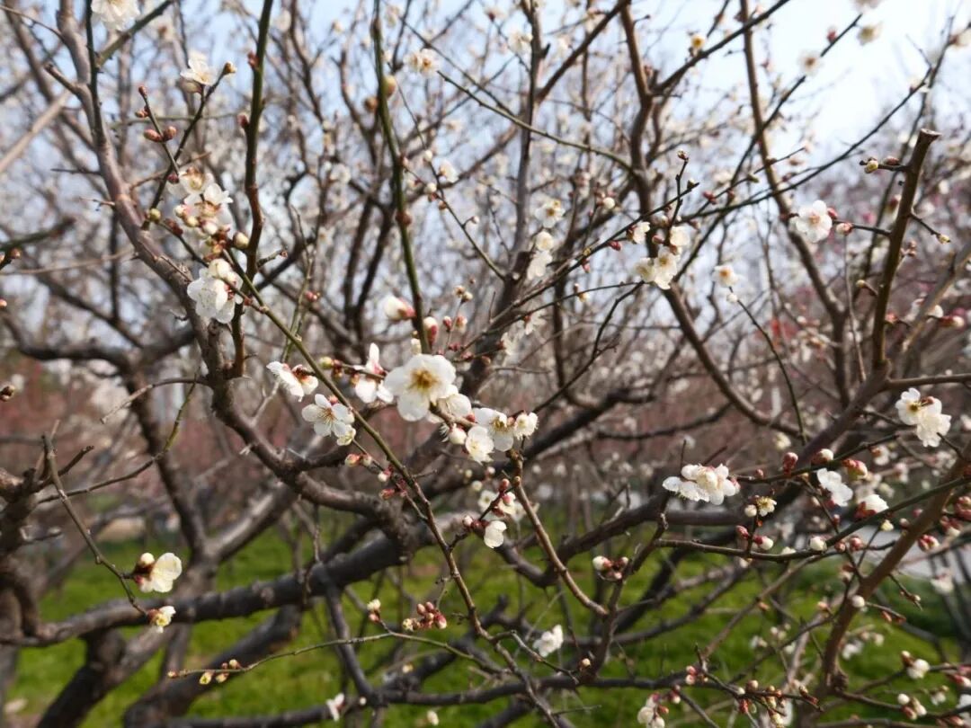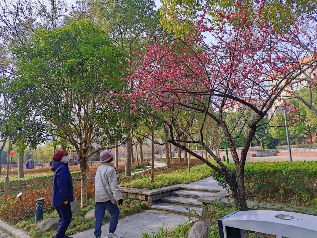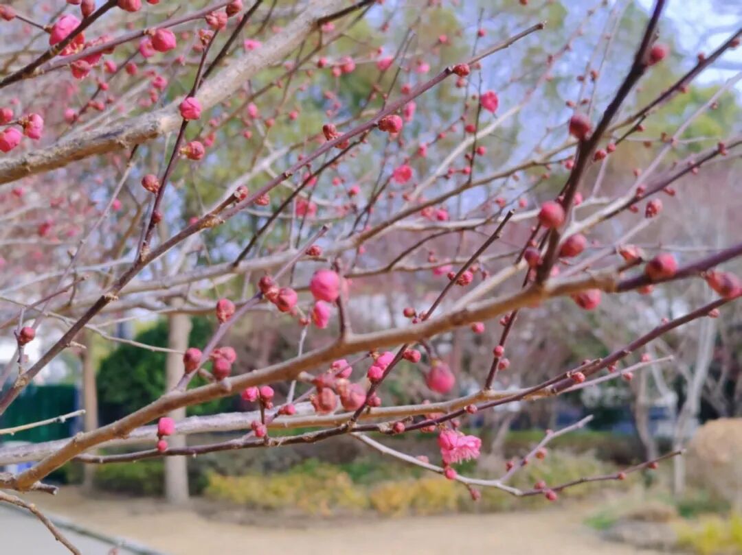步入园中,横斜的梅枝间,嫣红、粉白的花朵密密匝匝,如云似雪,与蜿蜒步道、宁静池水相映成趣。远处高楼轮廓隐约可见,都市繁华与园内静谧在此交融,让人恍然置身“城市绿肺”。