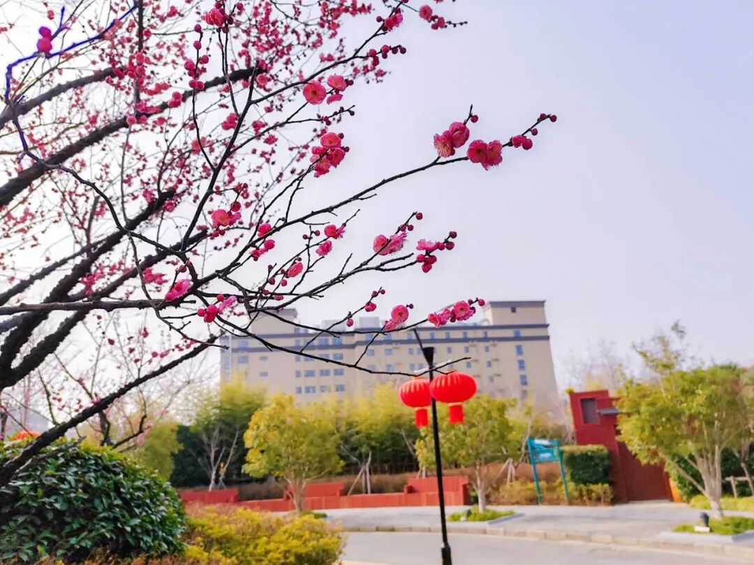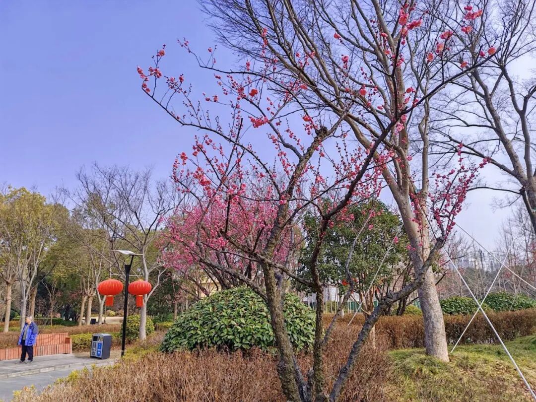 新春将至,公园挂起红灯笼,点点中国红与清雅梅花彼此映衬,更添一份融融暖意。