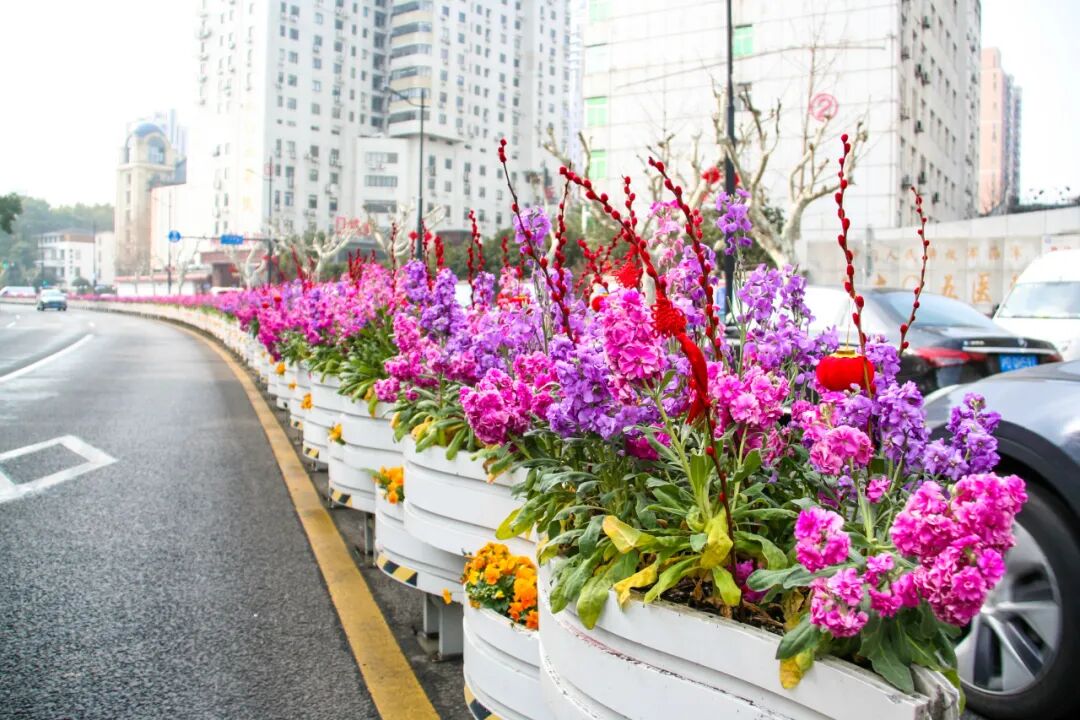 长宁的主要道路也披上了节日盛装。长宁路、华山路、江苏路、虹桥路等路段的花箱以“生态植物+年味装饰”为主题,选用紫罗兰、霹雳石竹、角堇等明快花卉,搭配挂满红果的北美冬青与银柳,营造出热烈而富有层次的视觉效果。枝头悬挂的迷你灯笼、红色锣鼓与编织藤球,让传统喜庆元素与现代园艺设计巧妙碰撞,为冬日街道增添了质朴的暖意与灵动趣味。