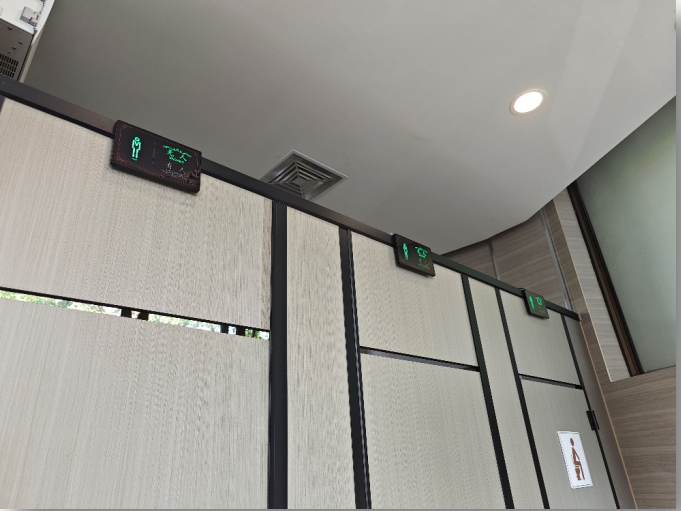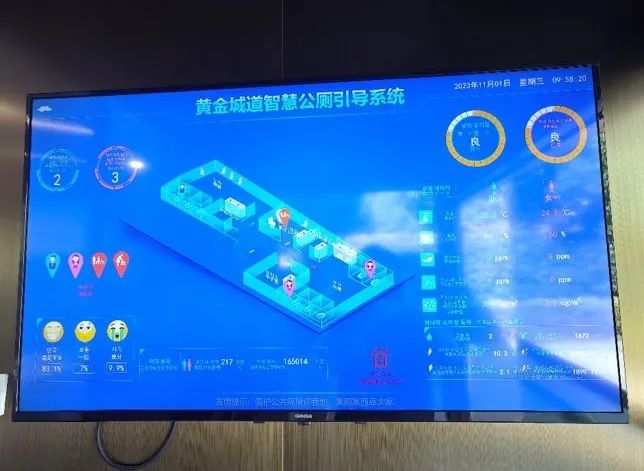 除此之外,公厕也充满了功能创新之美,通过安装智慧公厕引导大屏,实现了引导大屏能实时展示公厕布局、厕位使用情况、厕位空闲数量、气体、温湿度信息等环境数据,使如厕人员能够直观了解厕所实时使用情况和公厕环境,更便捷地解决如厕人员需求。