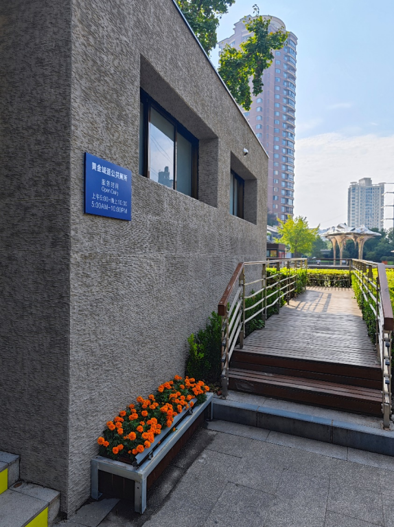 黄金城道步行街公厕,位于长宁区虹桥古北社区黄金城道步行街最西端。公厕外观设计美,融入了上海特有的海派建筑文化,极具有现代感,呈现简约大方。结合其所处的地理位置,以银杏图案设置装饰画,与黄金城道步行街的银杏景观遥相呼应,进一步增添了文化气息。夜间,公厕外墙LED灯亮起,氛围静雅温馨。