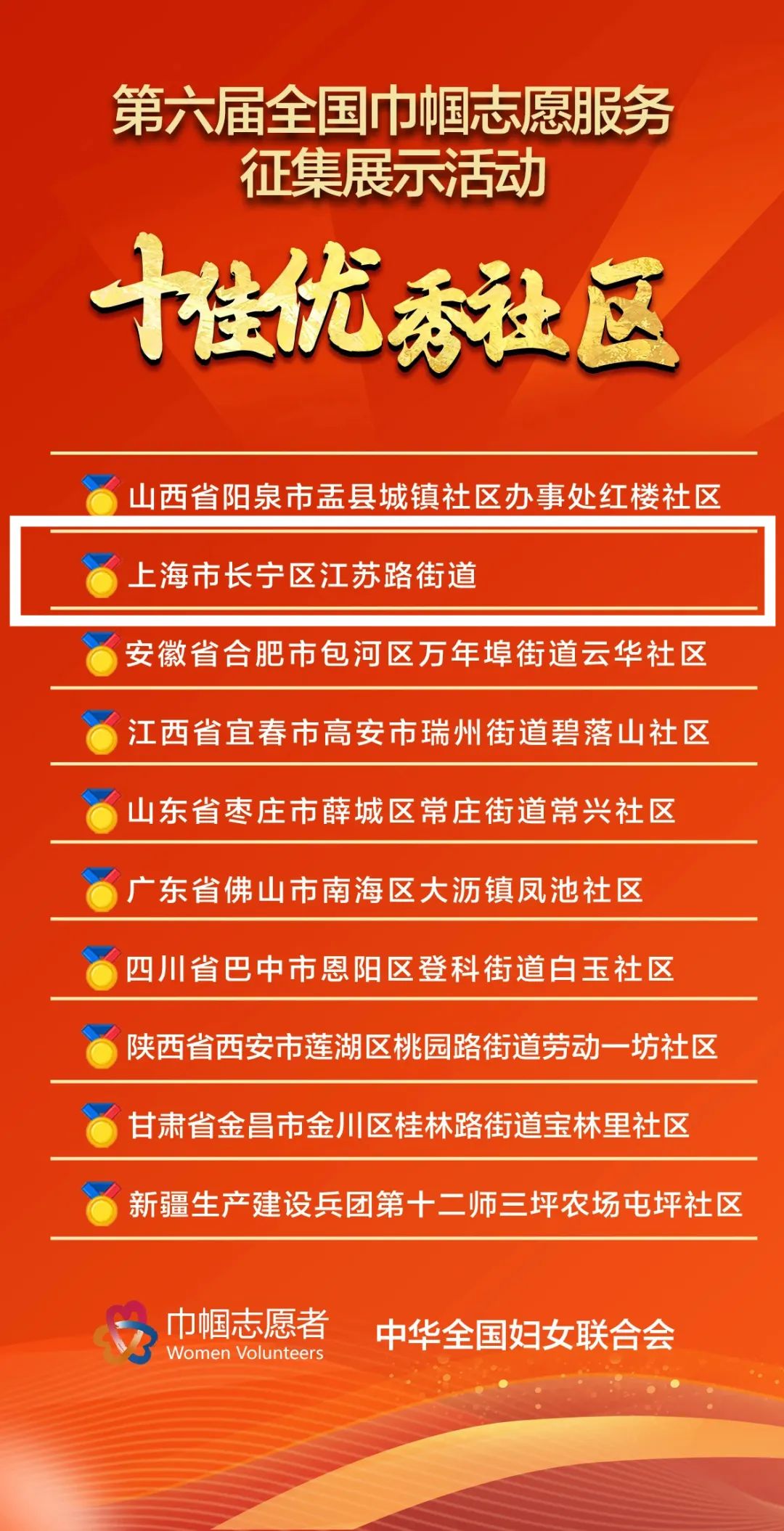 日前,全国妇联举行了第三届全国巾帼志愿服务微电影大赛、第六届全国巾帼志愿服务征集展示活动揭晓仪式。其中,长宁区江苏路街道获评“十佳优秀社区”。