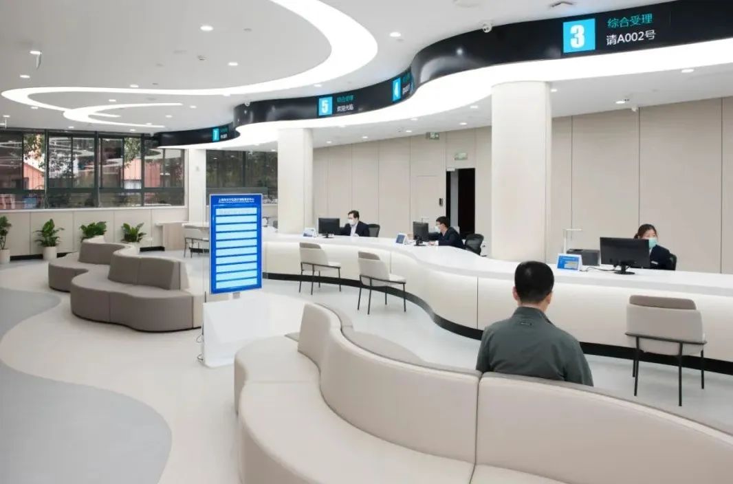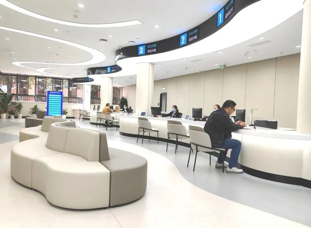 全新的排队等候区配备了舒适的沙发、叫号牌、饮水设备、老花镜等便民设施,既满足业务功能需求,又充分考虑到群众办事的合理需求。双排弧形沙发提升了等候的舒适度,中间竖立的叫号牌方便居民查看进度,流线形的柜台与顶灯营造了大厅温馨、灵动的氛围。