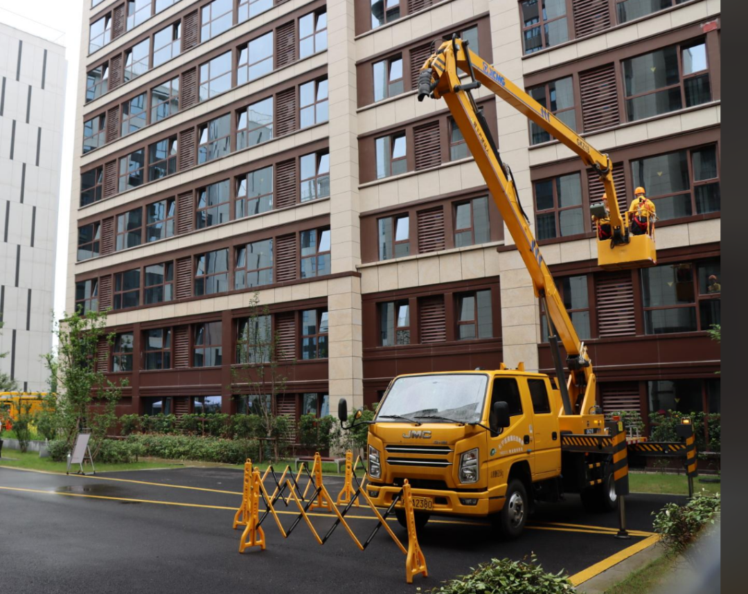 勘察现场、确定抢险方案……在安全员的引导下,工作人员快速启动特种作业车,将两名做好防护措施的抢险人员送至高空,对即将坠落的外立面进行加固处理,后又排查高坠隐患,高效排除了险情。