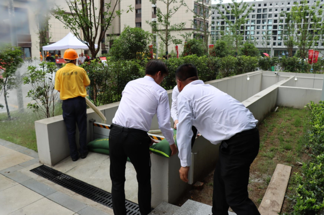 各抢险人员训练有素,在地库入口快速铺设沙袋、挡板阻断雨水倒灌地库,并启动抽水设备将地库积水排出。