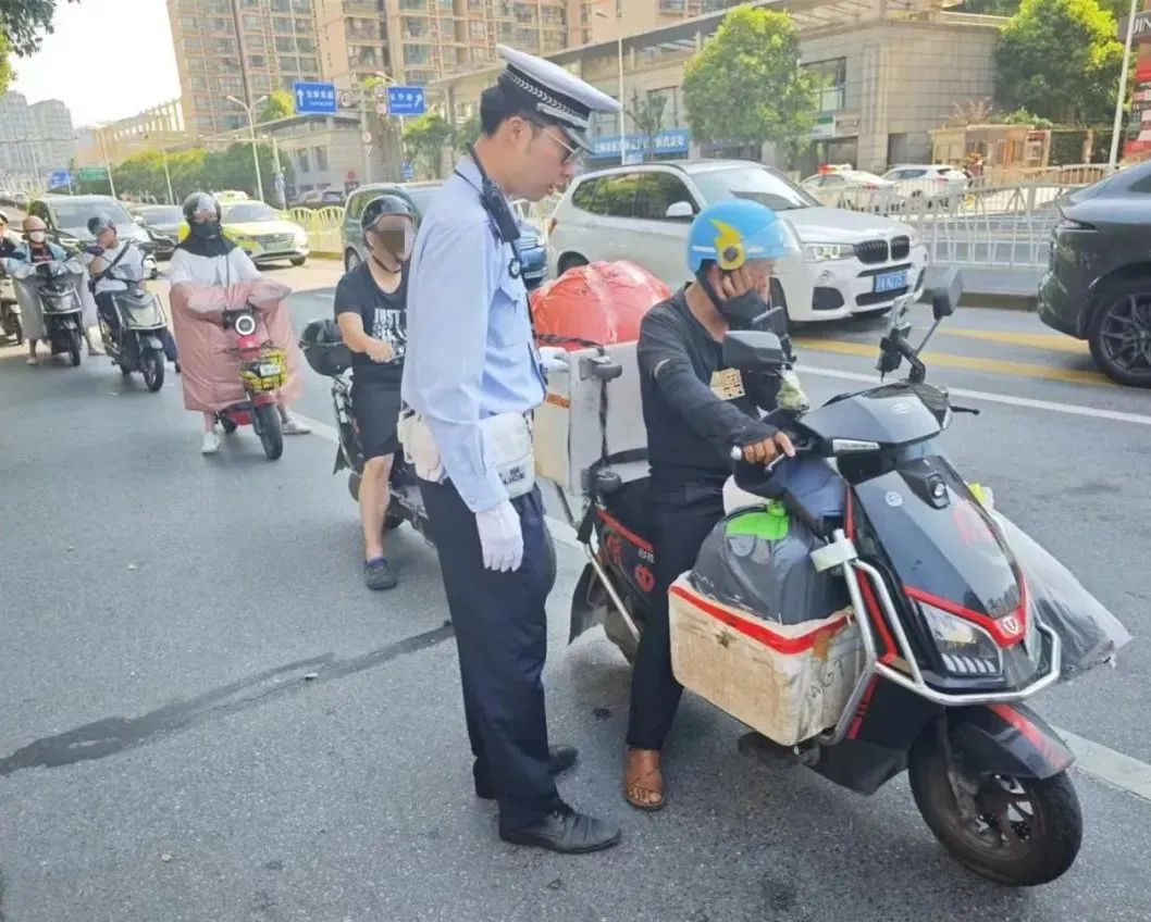 二大队民警对驾驶电动自行车未佩戴安全头盔的违法行为进行教育处罚