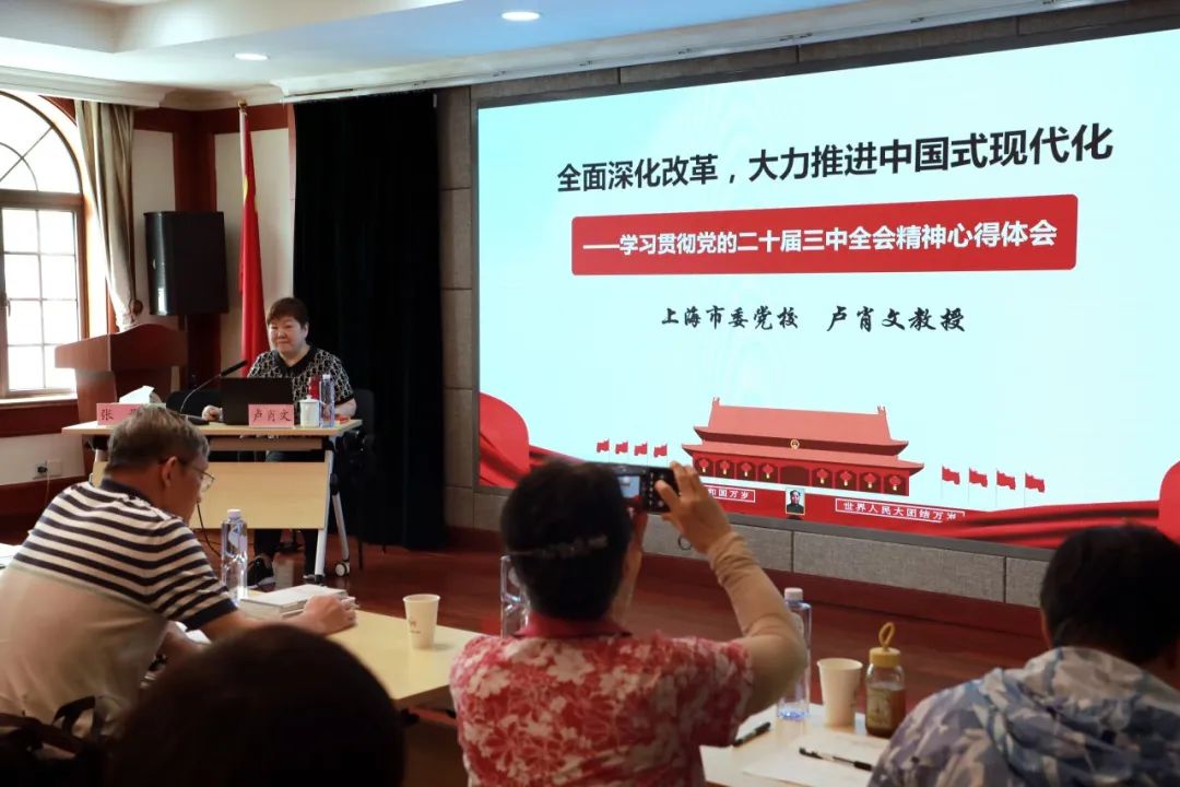 “党的二十届三中全会召开的深刻背景与重大意义是什么?《决定》的基本框架与核心要义有哪些?学习全会精神有哪些重大部署与基本要求?”在开班第一课上,来自上海市委党校科学社会主义教研部的卢肖文教授,从三大方面“划重点”,全面解读党的二十届三中全会精神,深入浅出、旁征博引的授课,吸引了离退休干部全心聆听、认真记录。