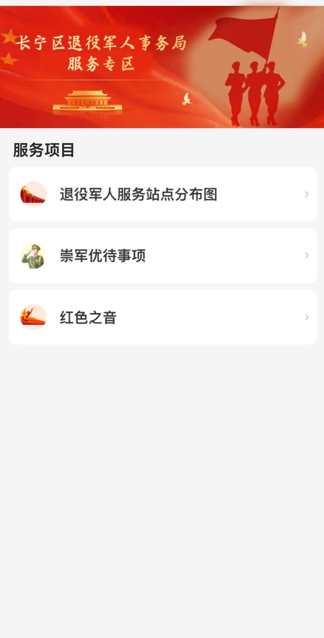 据介绍,活动中“随申办APP”长宁区旗舰店“退役军人事务局服务专区”也同步上线,专区设有站点分布图、崇军优待事项、红色之音等板块,方便各类服务对象寻找最近的服务站点,实时掌握并享受身边的崇军优先、优惠、优待项目。