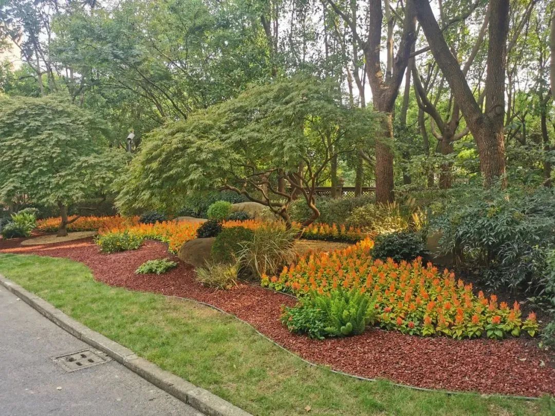 新泾公园北门景观花坛中矗立着两株造型独特的羽毛枫,作为整个花坛的中心和主景树。花坛下铺黄金水洗石并用棕色隔色带围挡,烘托出羽毛枫的优美姿态。景石边点缀有色叶球类植物提升景观效果。后层采用红花继木绿篱作为背景,中层采用桔黄色系的草花如彩叶草等作为主要植物,与前部的红色火山岩相搭配,形成了丰富的色彩和层次感。当深秋或初春时节到来时,羽毛枫叶子变红,整个花坛达到最佳观赏效果。