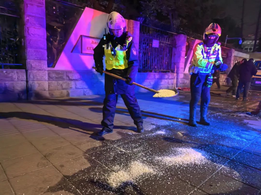 很快,增援民警与路政、供水等部门赶往现场。大家分工协作,路政、供水等养护人员对冻裂水管进行紧急抢修,并加装保温材料防止二次冻裂。民警则调集工业盐,对结冰路段实施撒盐作业。“当我们到达现场的时候,看到上街沿的部分积水已经有了结薄冰的情况,我们立即用工业盐撒在这个薄冰上面,以防止结冰情况进一步扩展,消除安全隐患。”长宁公安分局交警支队民警姚嘉文说道。