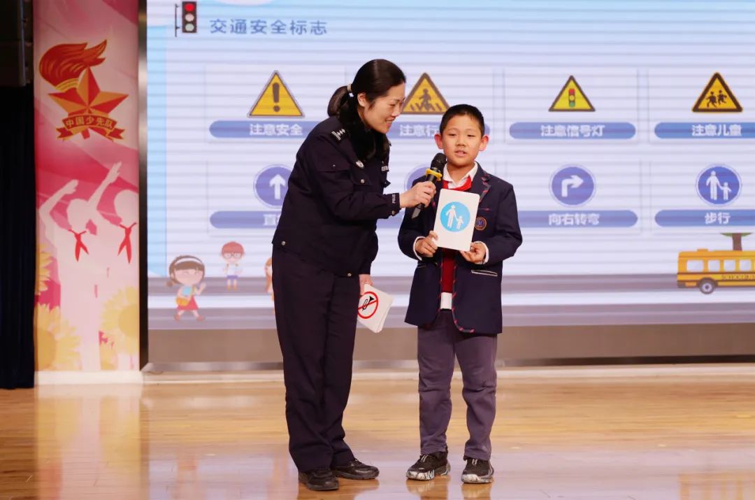 “一辆电动自行车只能带一名12周岁以下的未成年人”“在学校附近临时停车时应按规定的时间和地点停放并控制接送时间”……在东展小学,民警表示,每所学校上学、放学时的道路交通状况都有差别,因此,民警结合学校周边设置的常见交通标志图片深入讲解,并邀请同学上台开展互动问答,让大家更全面了解交通标志的作用和含义,增强了实际应用的能力。