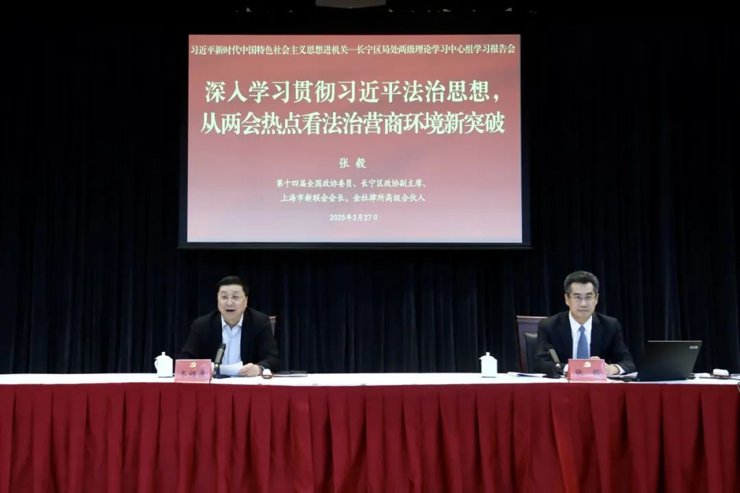 会议邀请第十四届全国政协委员、上海市新联会会长、长宁区政协副主席、金杜律师事务所高级合伙人张毅作《深入学习贯彻习近平法治思想,从两会热点看法治营商环境新突破》专题辅导报告。张毅结合近年来的实践经验、生动案例,以及参加全国两会的亲身经历,全面介绍了今年全国两会的关注焦点,深入阐述了以构建全国统一大市场为重点,全力破除体制机制障碍,激发全社会内生动力和创新活力的一些思考,对长宁在法治轨道上全面推动全区经济社会高质量发展提供了有力指导。