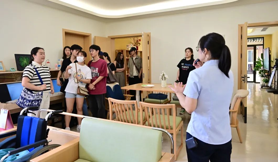 当天上午,学生们来到新泾五村“爱馨苑”。这里是长宁区首个集智能化、精准化、精细化为一体的智慧康养服务中心、智慧型残疾人综合服务中心,在工作人员的引领下,大家参观了智能健康监测设备、AI助老机器人等一系列智慧养老设施以及无障碍辅助器具,在深入了解智慧养老服务模式的同时,也对上海社区无障碍环境建设的成果有了更清晰的认识。