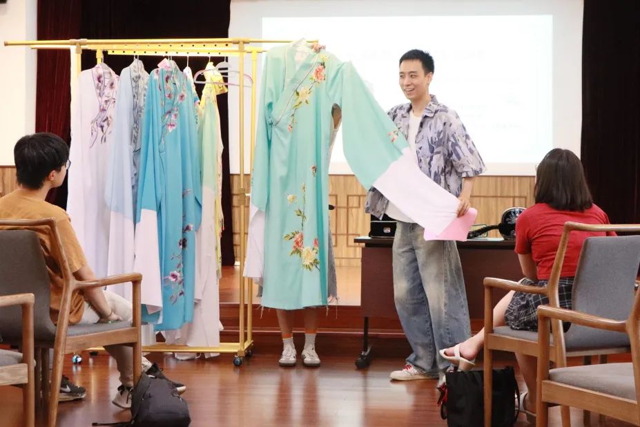 下午,学生们转场至长宁区非物质文化遗产保护中心,开启了一段精彩的非遗文化探索之旅。中心工作人员、上海城市推荐官朱严君向大家介绍了越剧这一国家级非物质文化遗产的历史渊源与艺术特色。“越剧以其婉转悠扬的唱腔、细腻传神的表演著称,《梁祝》是其中的经典之作,讲述了一段忠贞不渝的爱情故事……”朱严君一边介绍,一边现场表演了《梁祝》中的经典唱段,举手投足间尽显越剧的独特韵味,带领同学们走进越剧的艺术世界中。