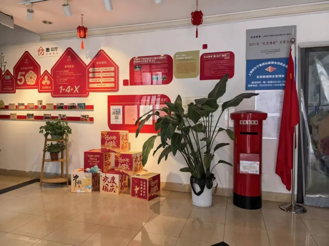 虹桥新城与天山怡景苑的出入口,仙霞慧生活物业以“国旗+灯笼”的经典组合铺就红色迎宾道。道路两侧,五星红旗与中秋宫灯间隔悬挂,形成一条流动的风景线;公共区域的“迎中秋、庆国庆”主题展板,以图文并茂的形式展现国家发展成就与社区文化故事。