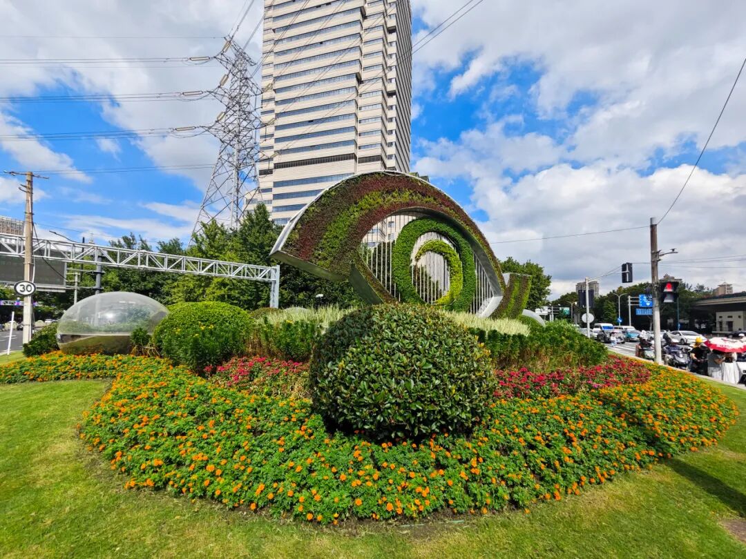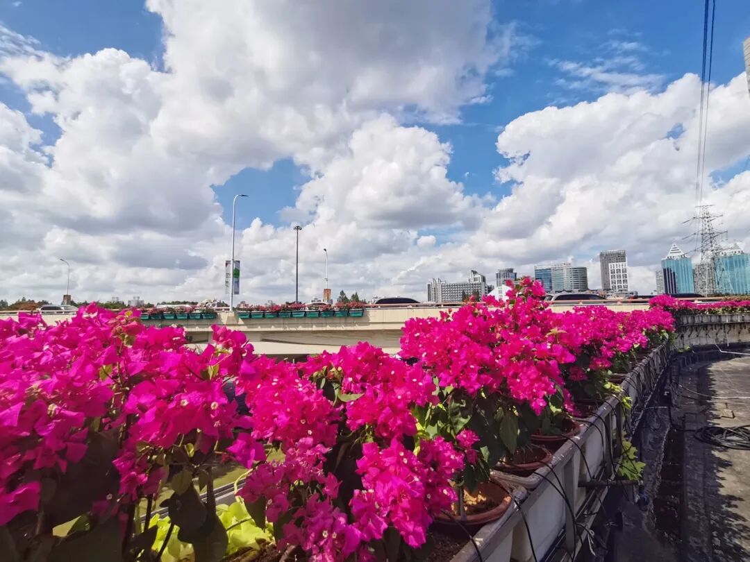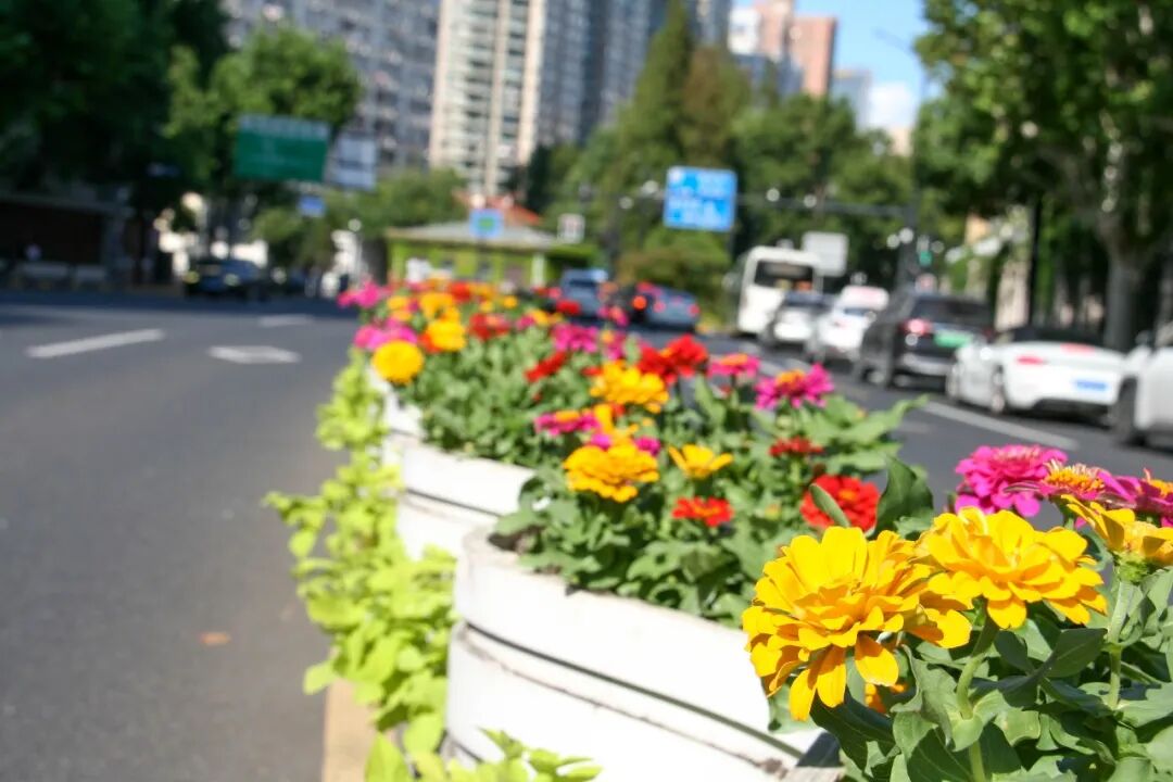 地标节点,是城市气质的点睛之笔。长宁路“小辣椒广场”的花卉布置现代感十足,悄然成为街角的热门打卡点;古北路“虹桥之眼”周边花团锦簇,昼间绚烂,入夜后与璀璨灯光交织,愈显灵动多姿。