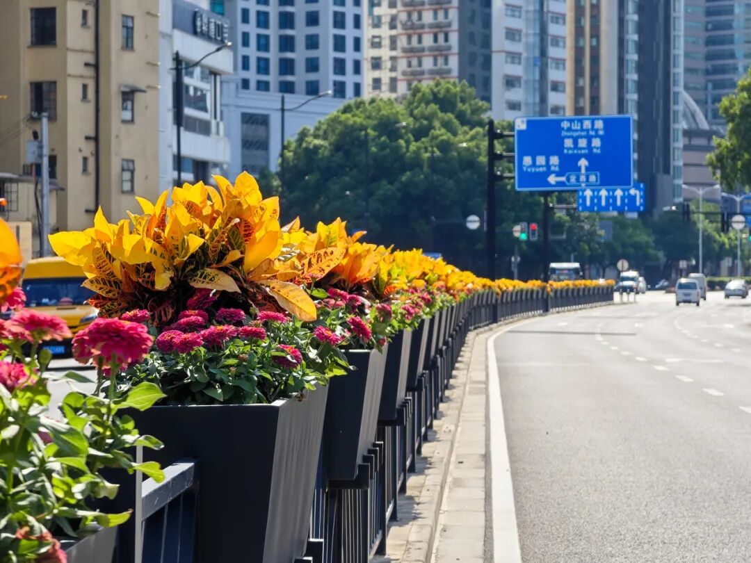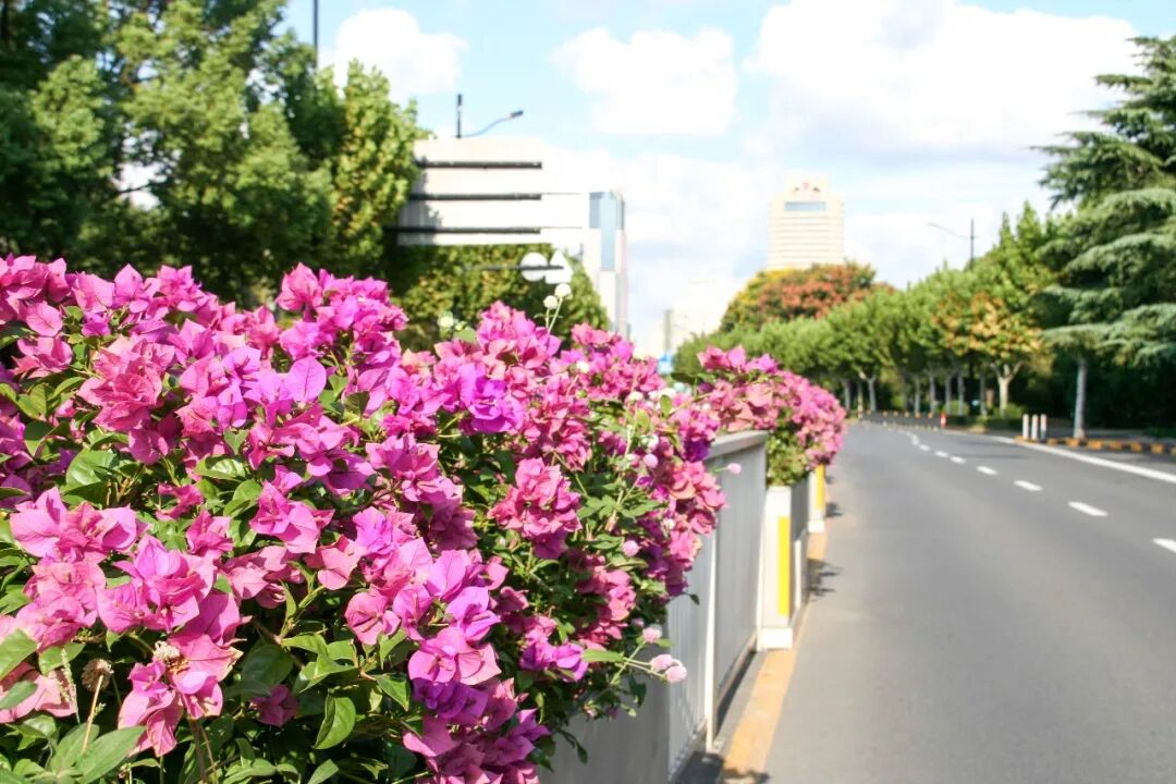 城市道路,是流动的风景线,也是区域的形象窗。长宁区对重点路段绿化景观进行精心升级,让出行之路也成为赏景之途。长宁路、虹桥路、华山路、江苏路等主干道的花箱焕然一新,延安西路沿线楼宇檐口添设立体绿化,形成“地有繁花、空见绿意”的多维景观。三角梅的热烈、百日草的明媚、千日红的娇艳、孔雀草的活泼,再点缀变叶木与金叶甘薯的斑斓叶色——这一抹抹以玫红、赤橙、金黄为主调的秋日色谱,不仅串联起城市的脉络,更让假日出行化作一次次与美的邂逅。