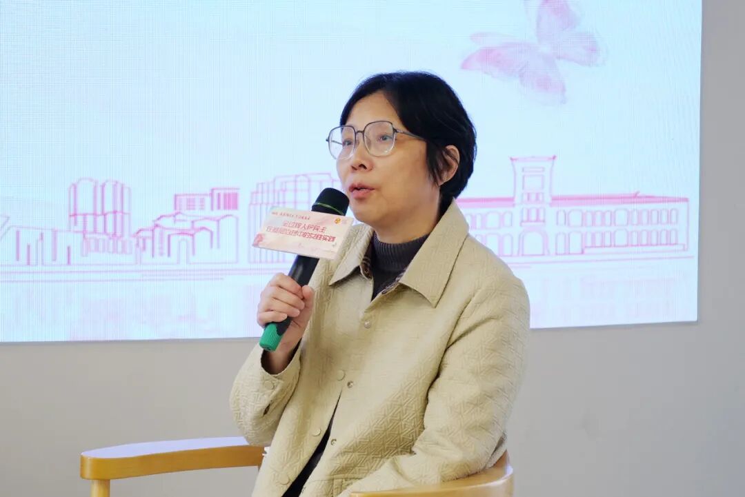 随后,三人还结合具体案例分享了各自在基层治理中的“她”实践与民主探索。朱卫红以愚园路街区为例,介绍了通过听证会、公约签订、志愿者队伍与党建联建“四个一”措施,化解商居矛盾,其中女性议事成员占比近70%。吴红萍聚焦“生境花园”“无忧谷”等生态建设项目,强调女性志愿者占比达80%,展现基层治理对居民美好生活需求的积极回应。邵启颖则围绕古北国际社区的“融情”治理,通过银杏认领、低碳打卡等项目,推动中外家庭共同参与,实现“街区互联、文化共融”。