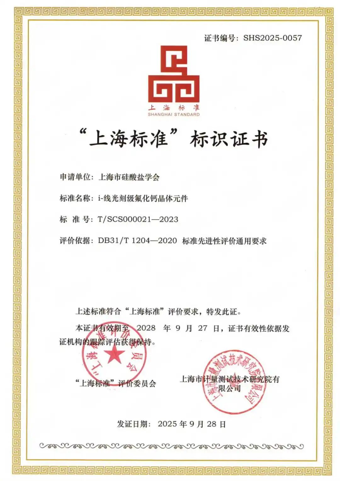 日前,在上海市举行的2025年“世界标准日”主题活动中,新一批12项“上海标准”正式发布。在长宁区市场监管局的指导和推荐下,由中国科学院上海硅酸盐研究所主导制定,上海市硅酸盐学会发布的团体标准《i-线光刻级氟化钙晶体元件》成功入选。