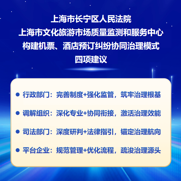 为进一步高效化解机票、酒店预订纠纷、引导行业规范健康发展、维护消费者合法权益,白皮书在明确共治主体的职能分工基础上,提出针对性治理建议,如行政部门完善制度设计,强化流程监管,筑牢治理根基;调解组织提升专业能力,深化协同衔接,激活治理效能;司法部门聚焦深度研判,做好法律指引,锚定治理航向;平台企业规范供应商管理,优化服务流程,疏浚治理源头等。