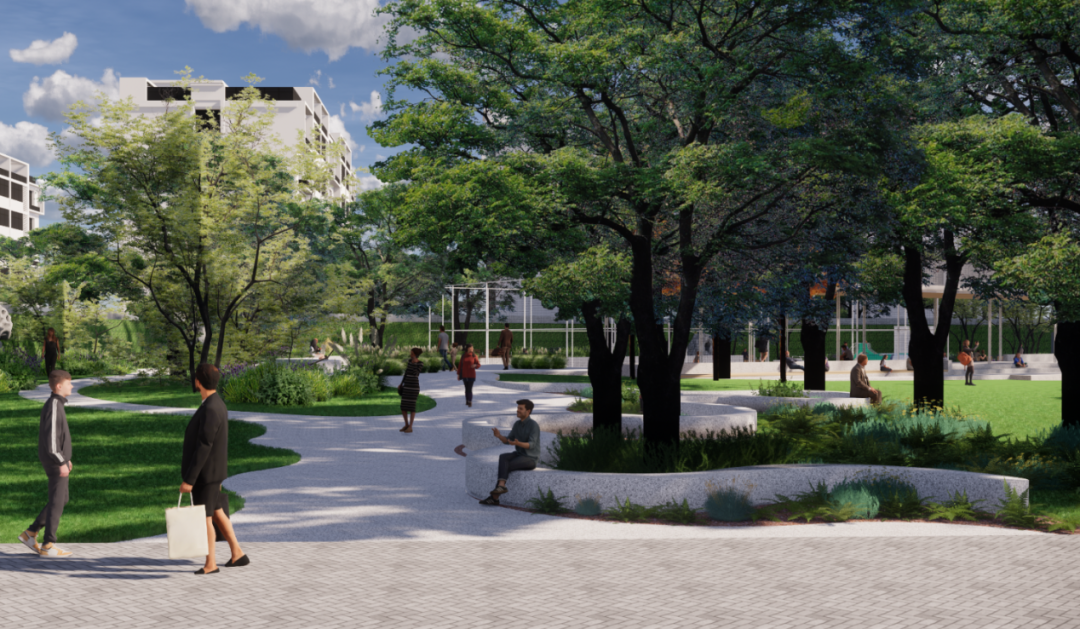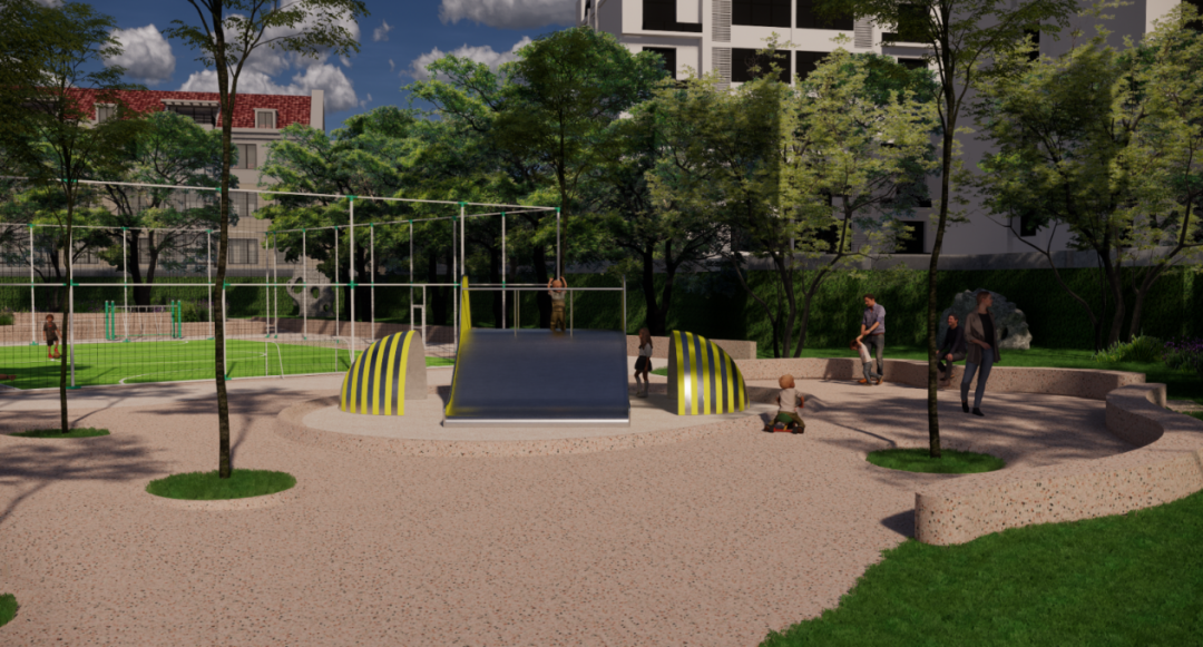 设计上突出“全龄友好”理念,尤其关注儿童成长需求。原场地中的消极空间将被重新激活,结合微地形营造富有韵律的户外活动场地。新增的攀爬、滑行等复合型游乐设施,适配不同年龄段儿童的发展特点;配套设置的科普标识与植物解说牌,让儿童在自然游戏中获得认知与启迪,实现“寓教于乐、寓学于趣”。