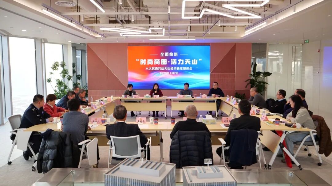 在助力区域经济高质量发展的道路上,天山路街道人大工委始终将全过程人民民主理念贯穿于服务发展的大局之中,面对“十五五”规划开局的关键之年,1月7日下午,一场主题为“全面焕新‘时尚商圈·活力天山’”的人大代表共话天山经济发展新年恳谈会在晶耀虹桥举行,来自区人大天山组的十余名代表齐聚于此,围绕新一年天山商圈的高质量发展集思广益、畅抒己见。