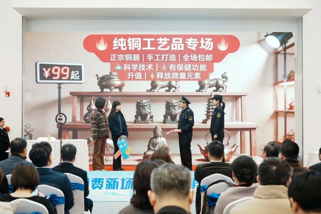 现场还进行了牟利性职业索赔预警提示的工作展示,旨在维护规范的市场秩序,保护合法经营者和广大消费者的正当权益;演绎了以“‘铜’货真相:直播间的虚假叫卖”为主题的消费警示小品,提醒广大消费者理性消费、依法维权,警惕消费陷阱,守护自身权益。