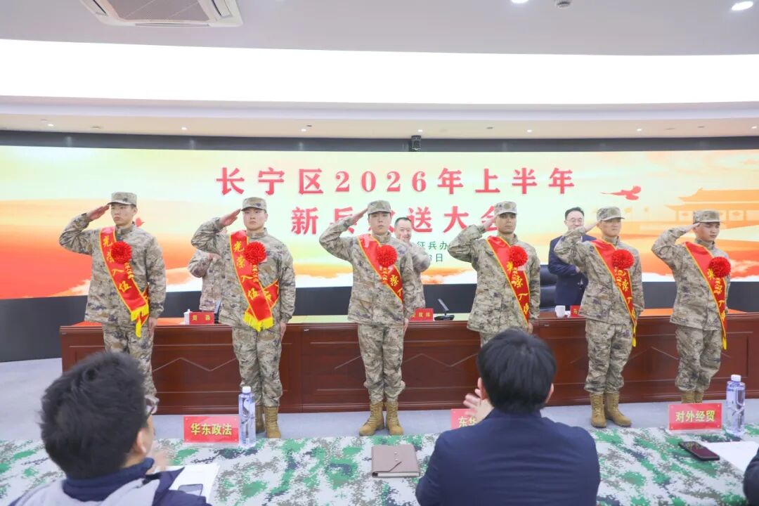 3月23日,长宁区2026年上半年新兵欢送大会举行。经过层层选拔,50余名热血青年身着迷彩、胸戴红花、肩披绶带,即将奔赴祖国的大江南北,开启军旅生涯。