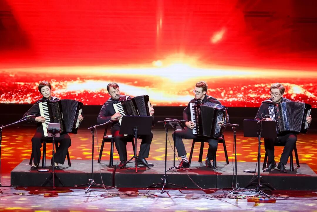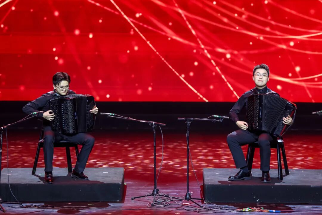 今年正值中国工农红军长征胜利90周年,国际手风琴联盟主席米高·帕特里尼,国际手风琴联盟艺术委员会主席亚历山大·谢利瓦诺夫,副主席格雷森·梅斯菲尔德与国际手风琴联盟艺术委员会委员、上海音协手风琴专业委员会主任王从余四位中外演奏家同台演绎新曲《复兴》,跨越国界的四重奏,既是对历史的深情回望,更是对时代新声的豪迈开启,将现场氛围推向高潮。