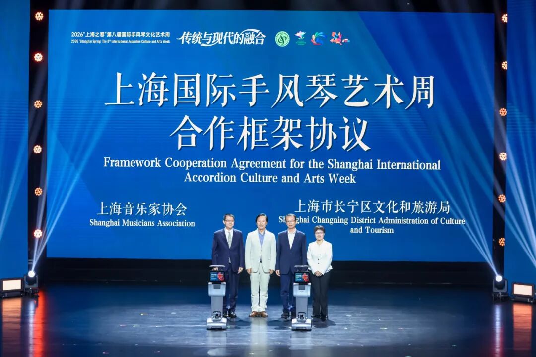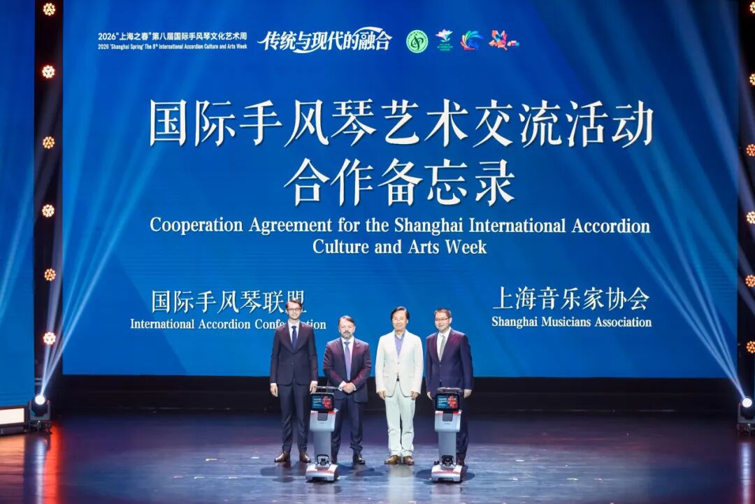 音乐会现场还举行了签约仪式。国际手风琴联盟与上海音乐家协会签署为期三年的合作备忘录,未来双方将在手风琴艺术交流、人才培养、演出策划等领域深度合作。同时,上海音乐家协会与长宁区文化和旅游局签订上海国际手风琴艺术周合作框架协议,标志着艺术周将继续落户长宁。