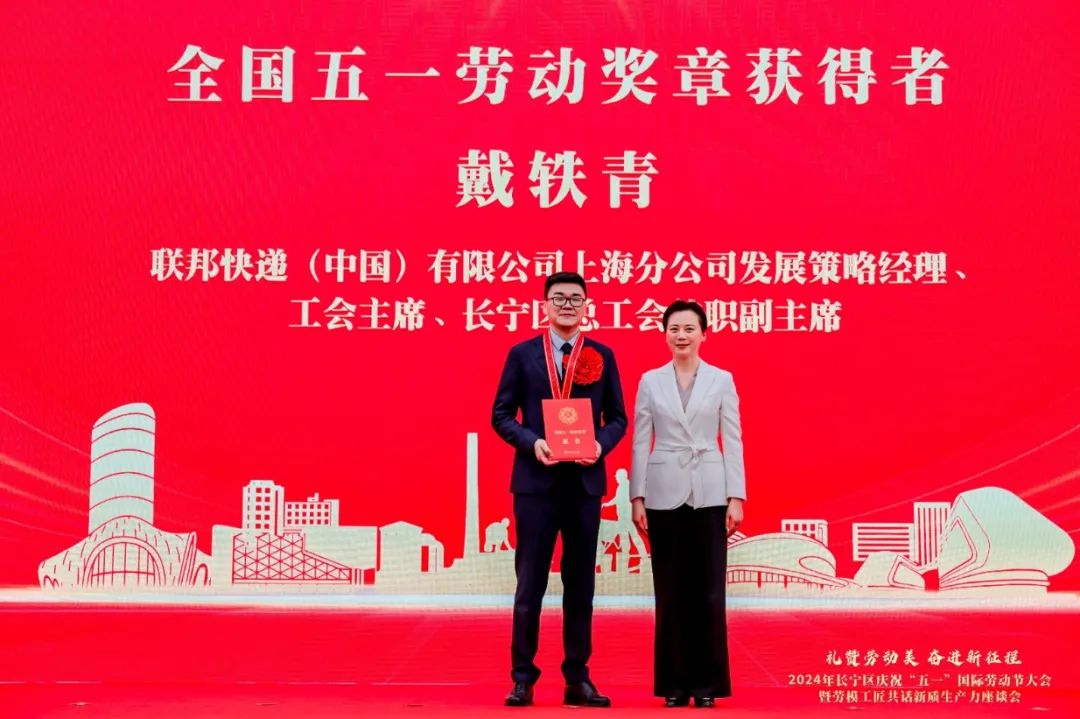上海市总工会党组书记、副主席沈军出席大会,并为全国五一劳动奖章获得者戴轶青授牌。