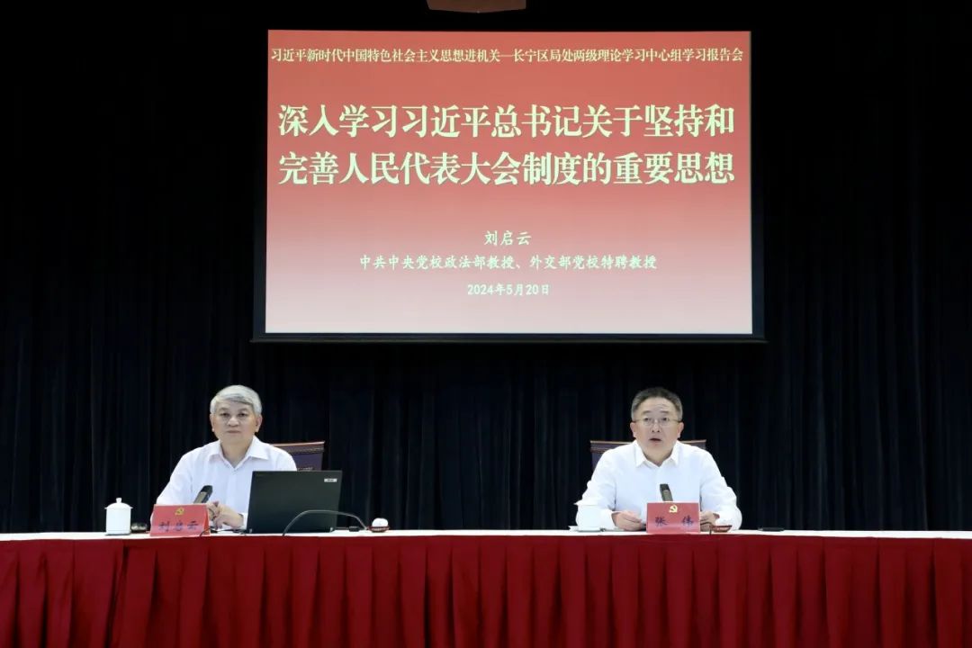 会议邀请中央党校教授刘启云围绕习近平总书记重要文章作专题辅导报告。刘启云的报告理论联系实际,运用鲜活案例,对习近平总书记关于坚持和完善人民代表大会制度的重要思想的丰富内涵进行了详细阐释,对长宁区进一步把握这一重要思想的精神实质、核心要义,提供有力指导。