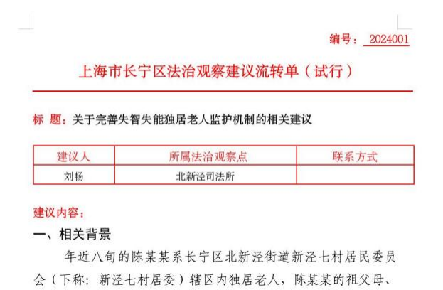 在长宁,和陈阿姨有着同样境遇的老人并不鲜见。为了给这个群体的晚年生活托底,法治观察员刘畅结合实践案例,从建立“双向联动发现机制”、探索“公职监护预警联动”、加强“公职监护人监管”等方面,提出了“完善失能失智独居老人监护机制的观察建议”。值得欣喜的是,建议书得到了区人民法院、区民政局的响应。