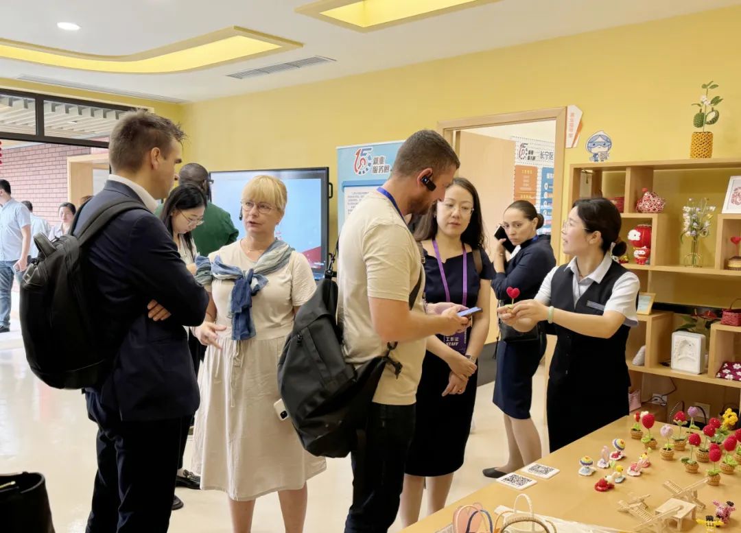 随后,研修员们来到新泾五村“爱馨苑”智慧养老服务中心,了解为民养老设施建设。该中心立足民生保障精准化、康养服务社会化、个性供给市场化,汇集日间照料、智慧康养、辅具康复、就业扶持、慈善救助等五大功能,融入智慧康养理念,为不同人群提供更加便捷暖心的公共服务。研修员们还体验了手工美食制作、旗袍走秀等具有中国传统文化特色的互动与交流活动,购买爱心编织艺术品,为慈善作贡献。