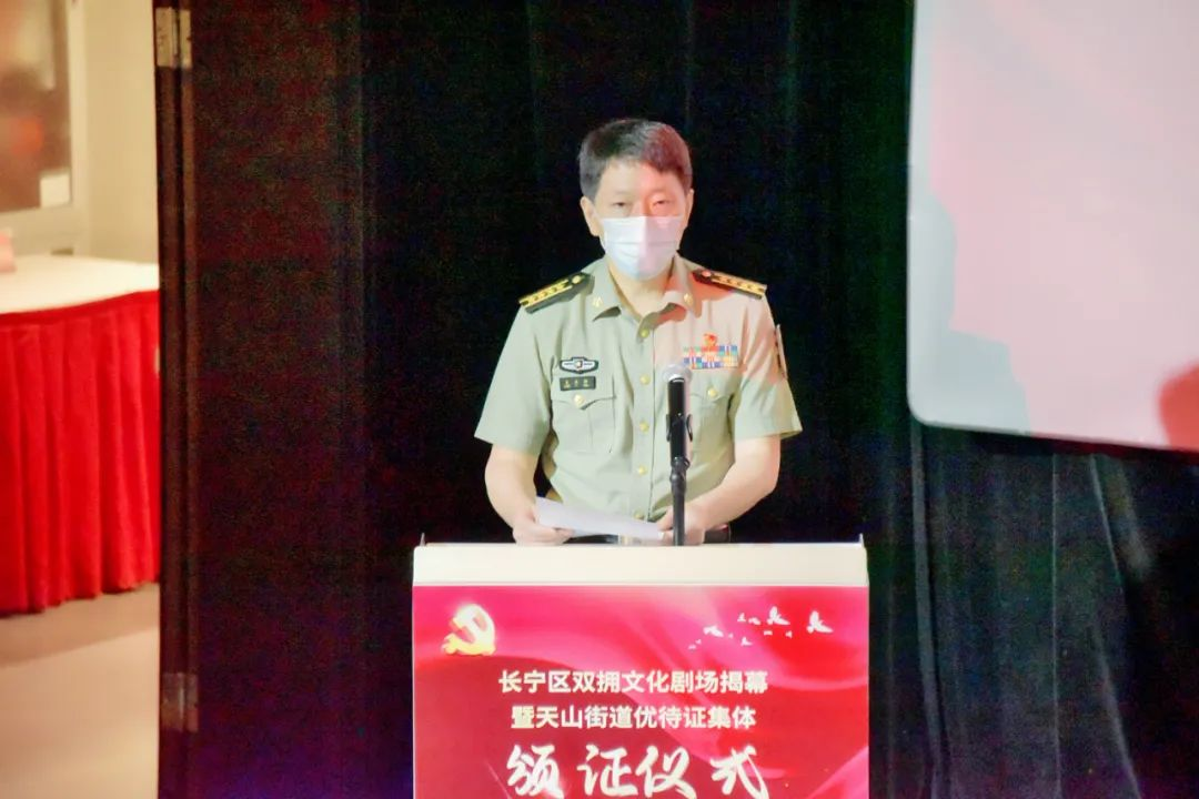 长宁区委常委、区人武部部长王立松,上海市拥军优属基金会长宁区工作委员会会长刘英,长宁区退役军人事务局党组书记、局长、区双拥工作领导小组办公室主任徐泽建,天山路街道党工委书记余双等相关部门领导及天山辖区退役军人、优抚对象代表参加。