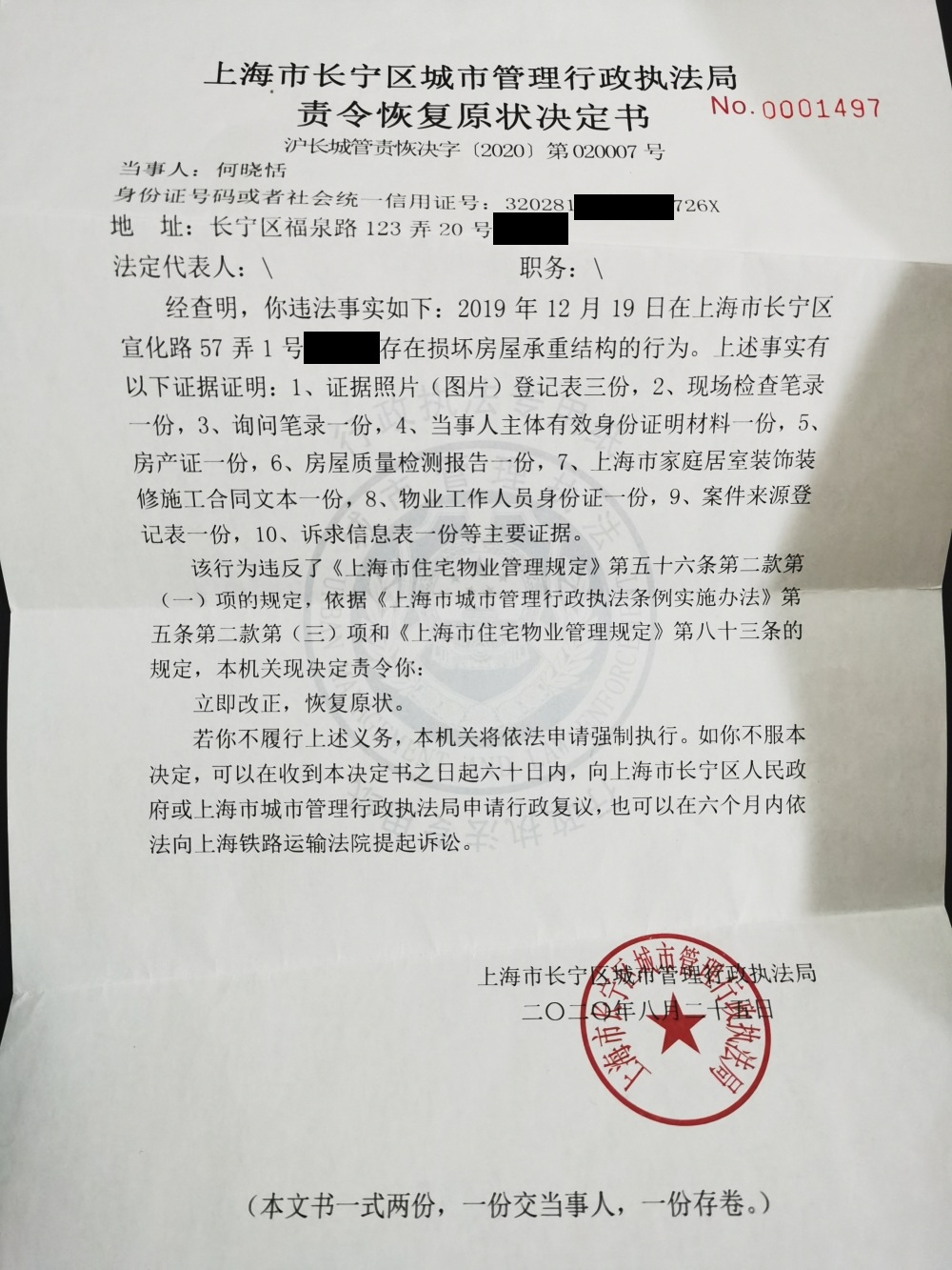 宣化路57弄1号404室损坏房屋承重结构责令恢复原状决定书