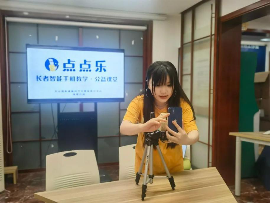 当看到“点点乐”长者智能手机公益课堂的招募信息时,她主动联系海棠公益毛遂自荐,成为了一名线上讲师。每周三上午9点,她都会准时出现在公益教学的直播间,用一个支架、一部手机开始教学。