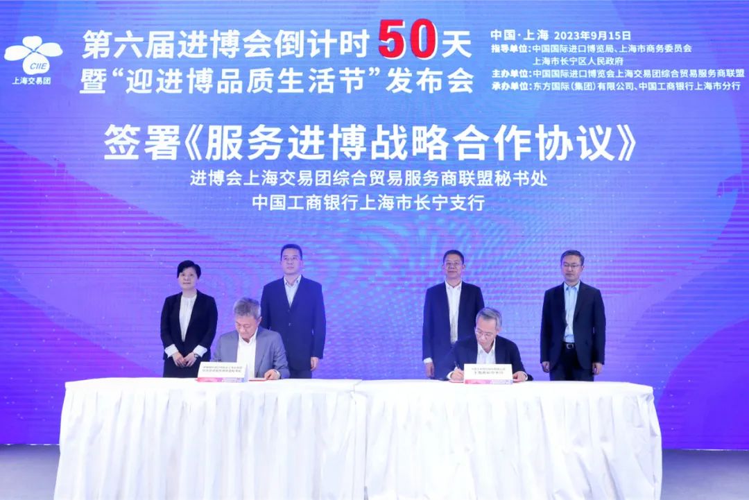 会上,进博会上海交易团综合贸易服务商联盟秘书处和中国工商银行上海市长宁支行签署《服务进博战略合作协议》。中国工商银行上海市分行、米其林(中国)投资有限公司、东方国际创业股份有限公司的负责人分别作为金融机构、进博会展商、采购商代表,共同发布《高水平开放助推高质量发展、新思路举措共享新市场机遇、齐心协力办好第六届进博会》宣言,表达了将持续服务进博、积极承接进博会溢出效应的决心。