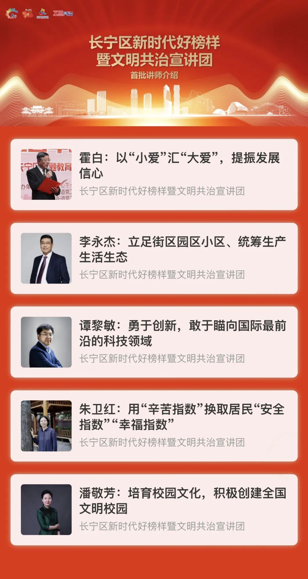 据了解,长宁区首批新时代好榜样暨文明共治宣讲团共有5位讲师,均来自江苏路街道。他们分别是:中国好人、全国最美家庭、全国最美志愿者、江苏路街道愚园路红色印迹宣讲团资深宣讲员霍白;上海市人大代表、上海市工商联副主席、上海市文明单位——上海创邑实业有限公司董事长李永杰;上海市政协委员、上海市青创联副会长、上海市人工智能行业协会理事、长宁区文明单位——上海西井科技股份有限公司董事长、首席执行官谭黎敏;全国优秀城乡社区工作者、长宁区第五届道德模范、江苏路街道岐山居民区党总支书记、居委会主任朱卫红和上海市人大代表、上海市文明校园——上海市第三女子中学校长潘敬芳。未来的时间里,5位讲师将陆续走进新时代好榜样直播间,分享他们的故事。