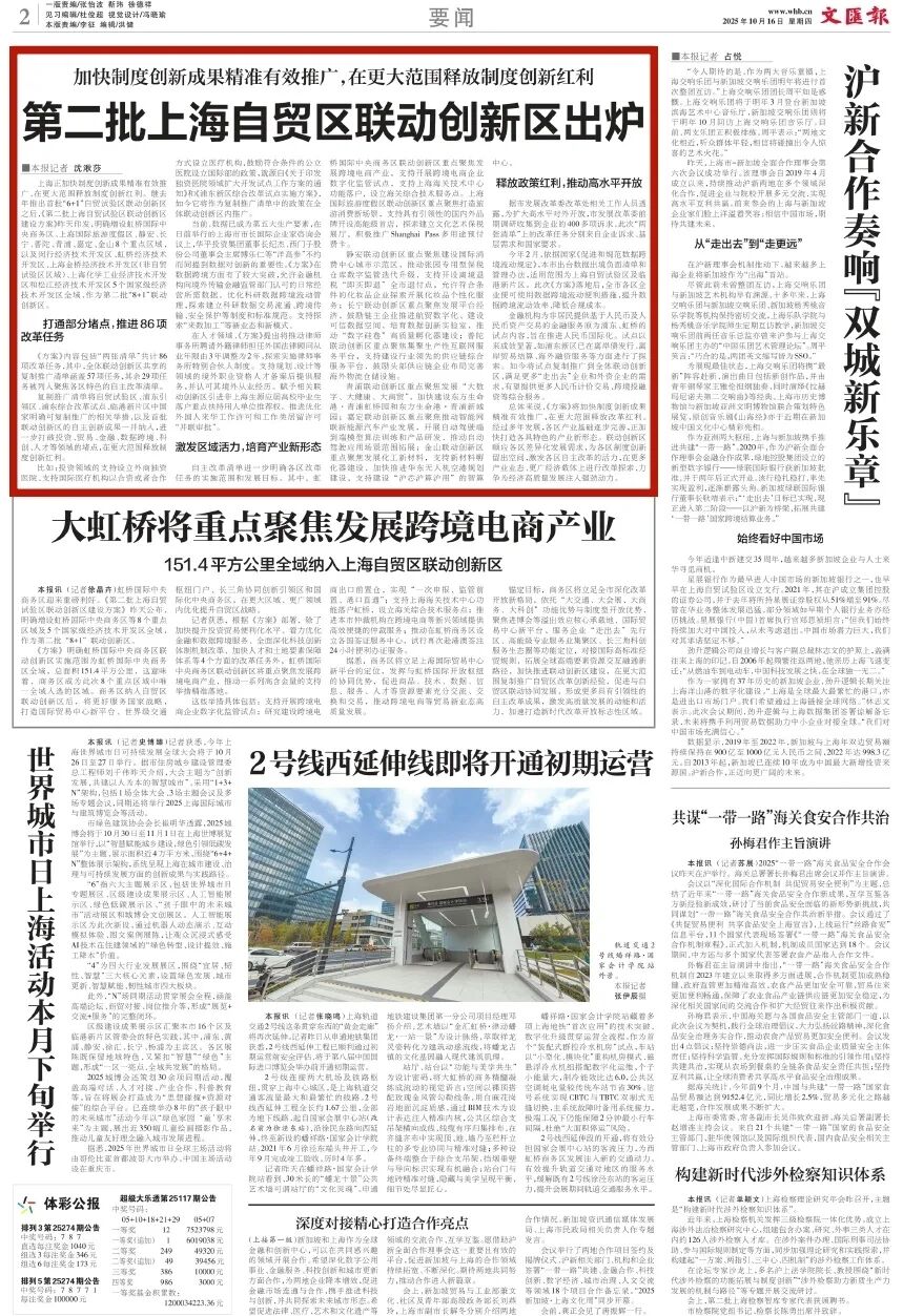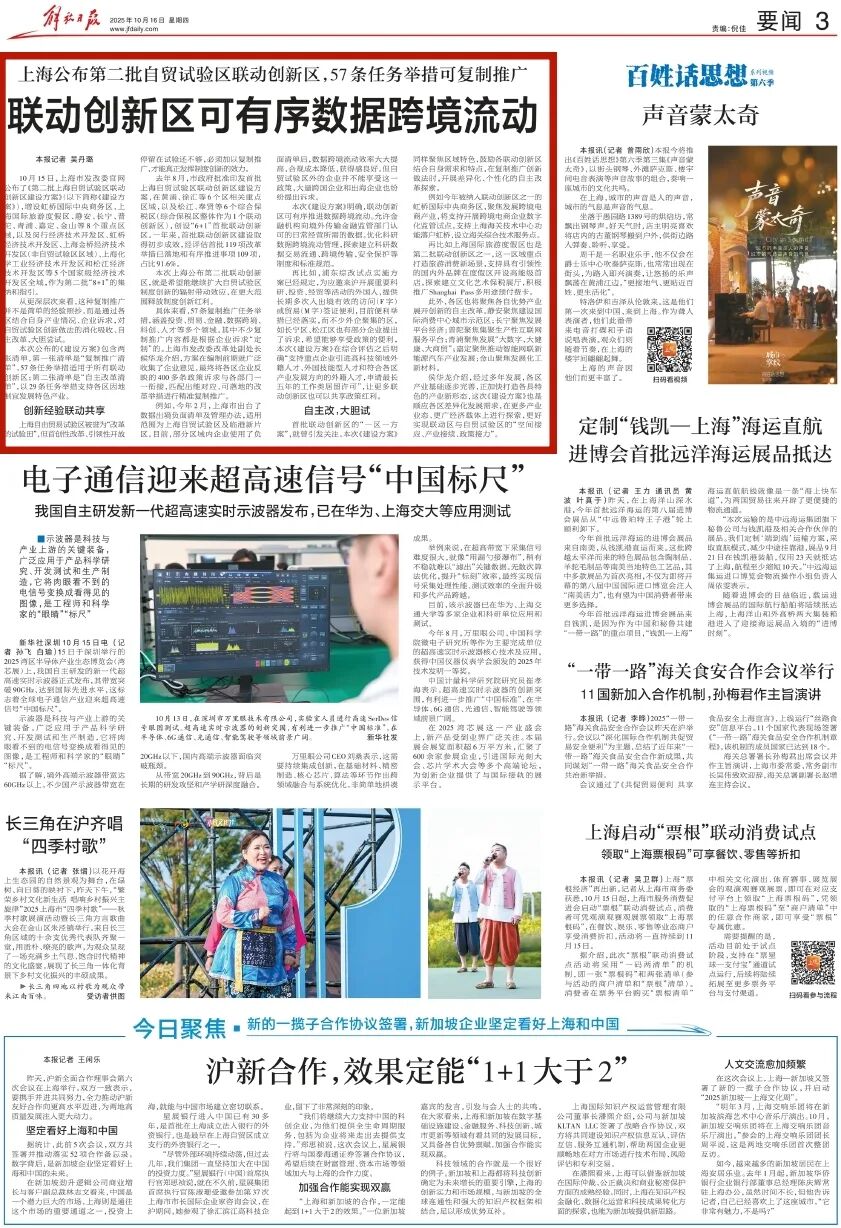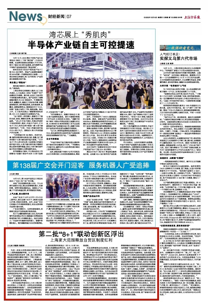 10月15日、16日,人民日报App、央视新闻App、中国新闻网、中国证券网、《解放日报》要闻版、《文汇报》要闻版、《上海证券报》、上观新闻、新闻综合频道“新闻报道”“新闻夜线”“上海早晨”栏目、东方卫视“东方新闻”栏目、上海人民广播电台“990早新闻”栏目、阿基米德App、澎湃新闻、界面新闻、第一财经、劳动报网、看看新闻网报道:继去年上海推出首批“6+1”自贸试验区联动创新区的基础上,15日又印发《第二批上海自贸试验区联动创新区建设方案》。《方案》明确增设长宁等8个重点区域,以及虹桥经济技术开发区等5个国家级经济技术开发区全域,作为第二批“8+1”联动创新区。长宁联动创新区重点聚焦发展平台经济,鼓励链主企业推进航贸数字化、建设可信数据空间,培育数据创新实验室。聚焦电子材料领域突破性科技成果率先转化和科技企业培育孵化,推动“数字硅巷”高质量孵化器建设。深化全国网络市场监管与服务示范区建设,设立市市场监管局广告监测评价中心直播监测分中心。