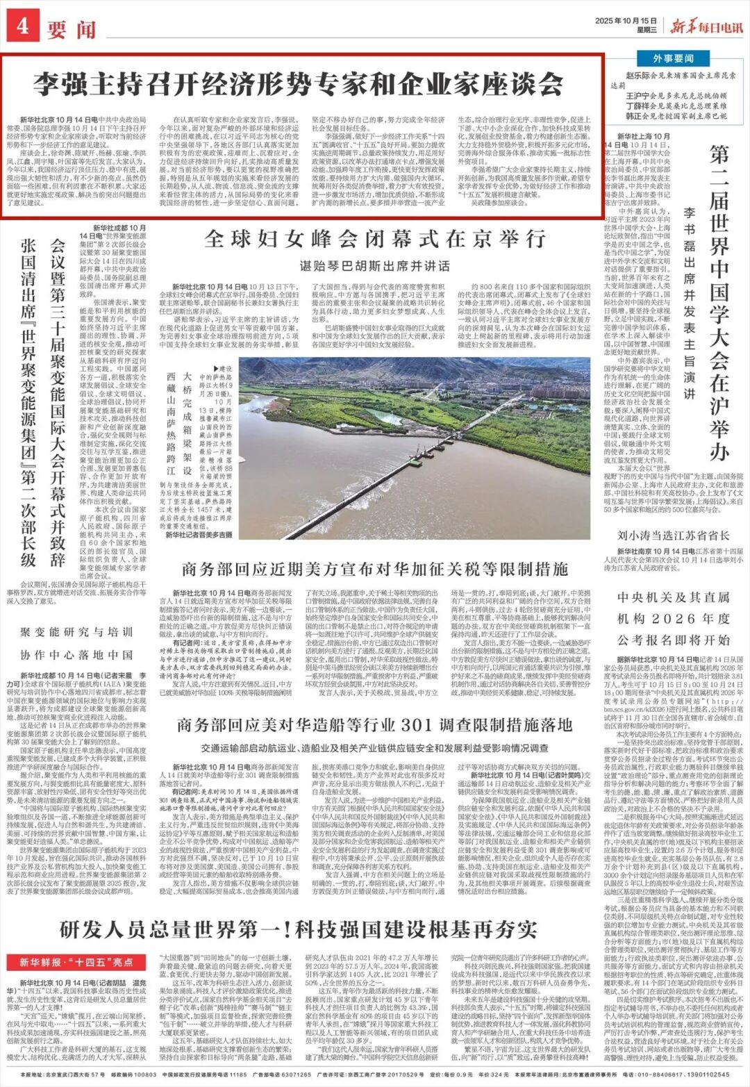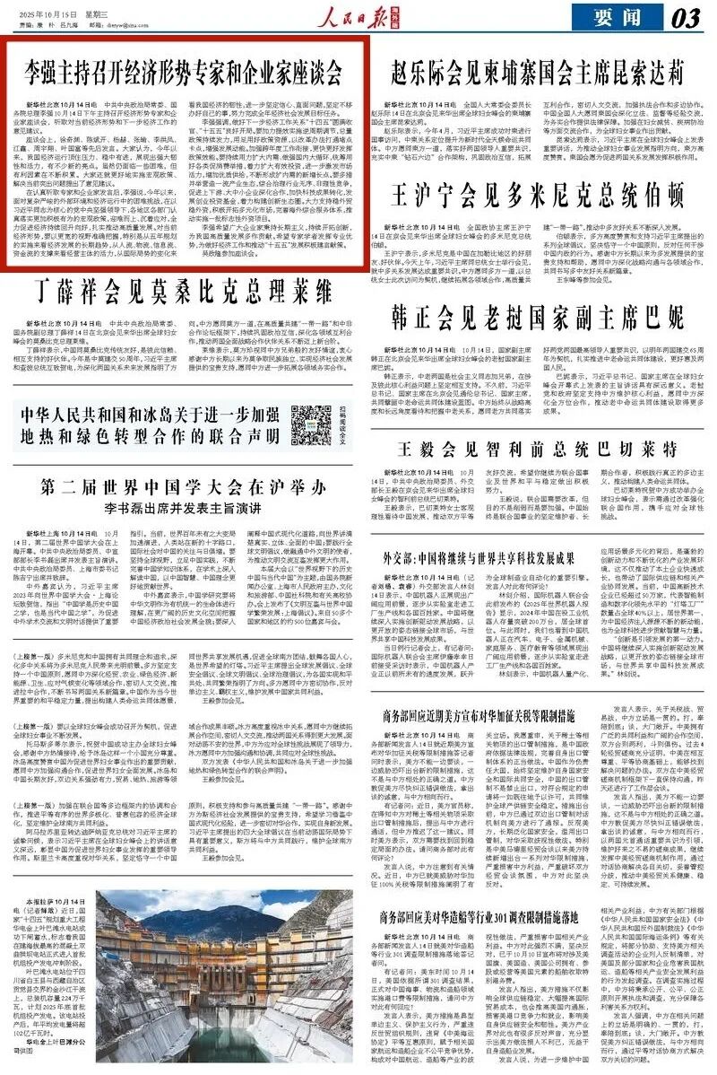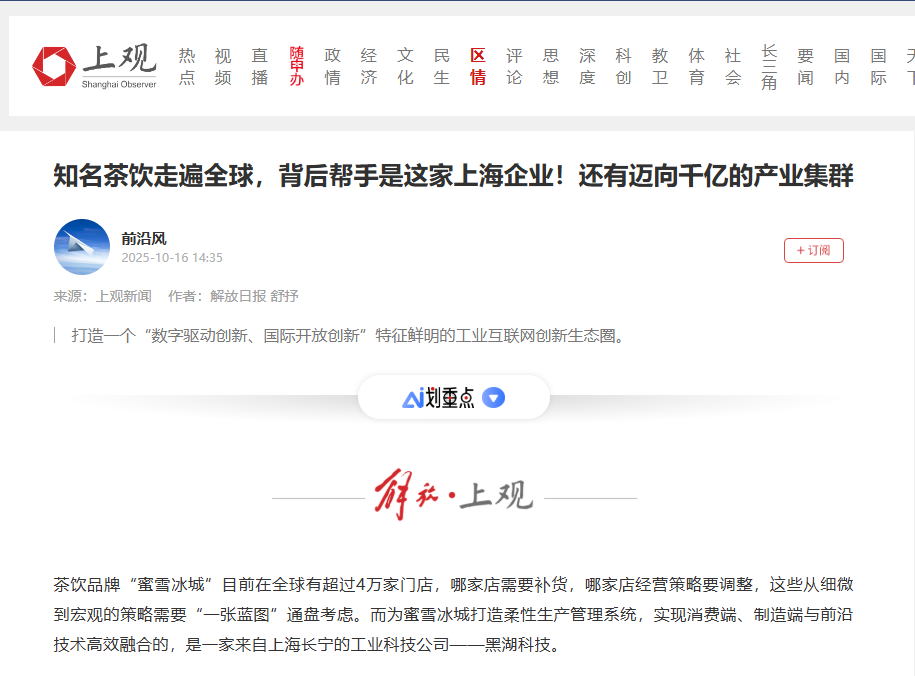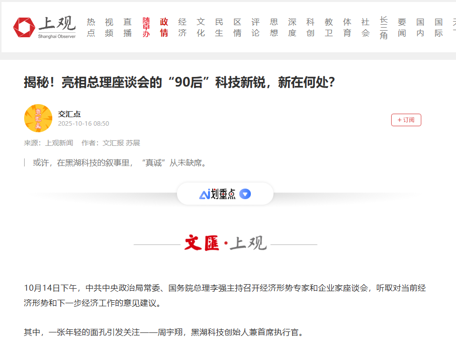 10月14日、15日,《人民日报》要闻版、《人民日报海外版》要闻版、《新华每日电讯》要闻版、CCTV13“新闻联播”栏目、《光明日报》要闻版、《经济日报》要闻版、《经济参考报》要闻版、《文汇报》要闻版、《上海证券报》头版、澎湃新闻、财联社、观察者网报道:中共中央政治局常委、国务院总理李强10月14日下午主持召开经济形势专家和企业家座谈会,听取对当前经济形势和下一步经济工作的意见建议。黑湖科技创始人周宇翔在座谈会上发言。黑湖科技总部位于上海市长宁区,成立于2016年,依托云计算、物联网、区块链、人工智能等前沿技术,先后推出黑湖智造、黑湖小工单、黑湖供应链等SaaS应用,构筑起入口级工业协同平台。