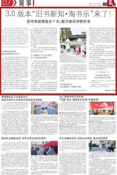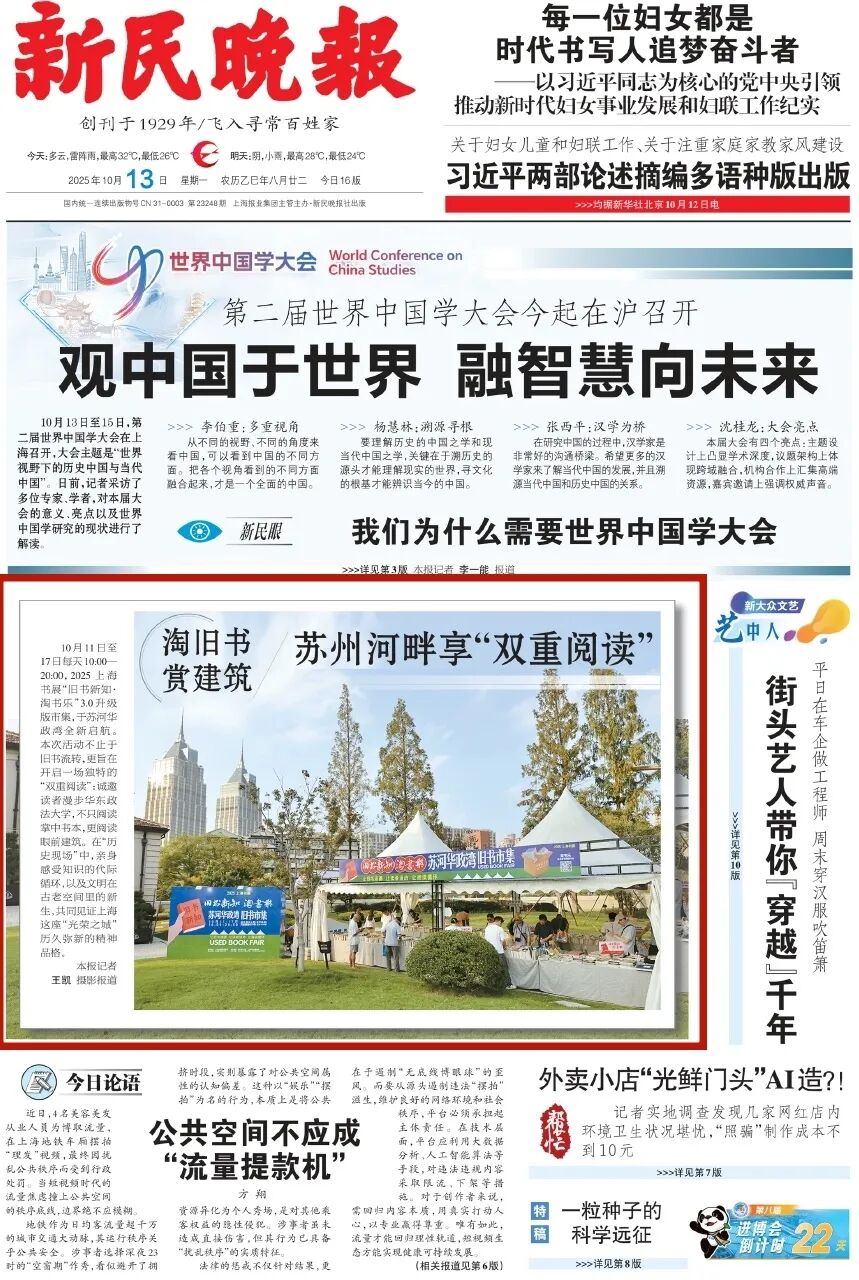 10月10日、11日、12日、13日,《文汇报》头版、《新民晚报》头版、《新闻晨报》、上观新闻、东方卫视“东方新闻”栏目、周到上海App、澎湃新闻App、澎湃新闻、东方网报道:2025年10月11日至17日,2025上海书展“旧书新知·淘书乐”3.0升级版市集在长宁苏州河华政湾举办。市集将“旧书流通、阅读循环、人际交流、文化传播”理念融合,力争向读者传递这样一个信号——阅读很时尚,历史很亲切,华政“潮”好玩。
