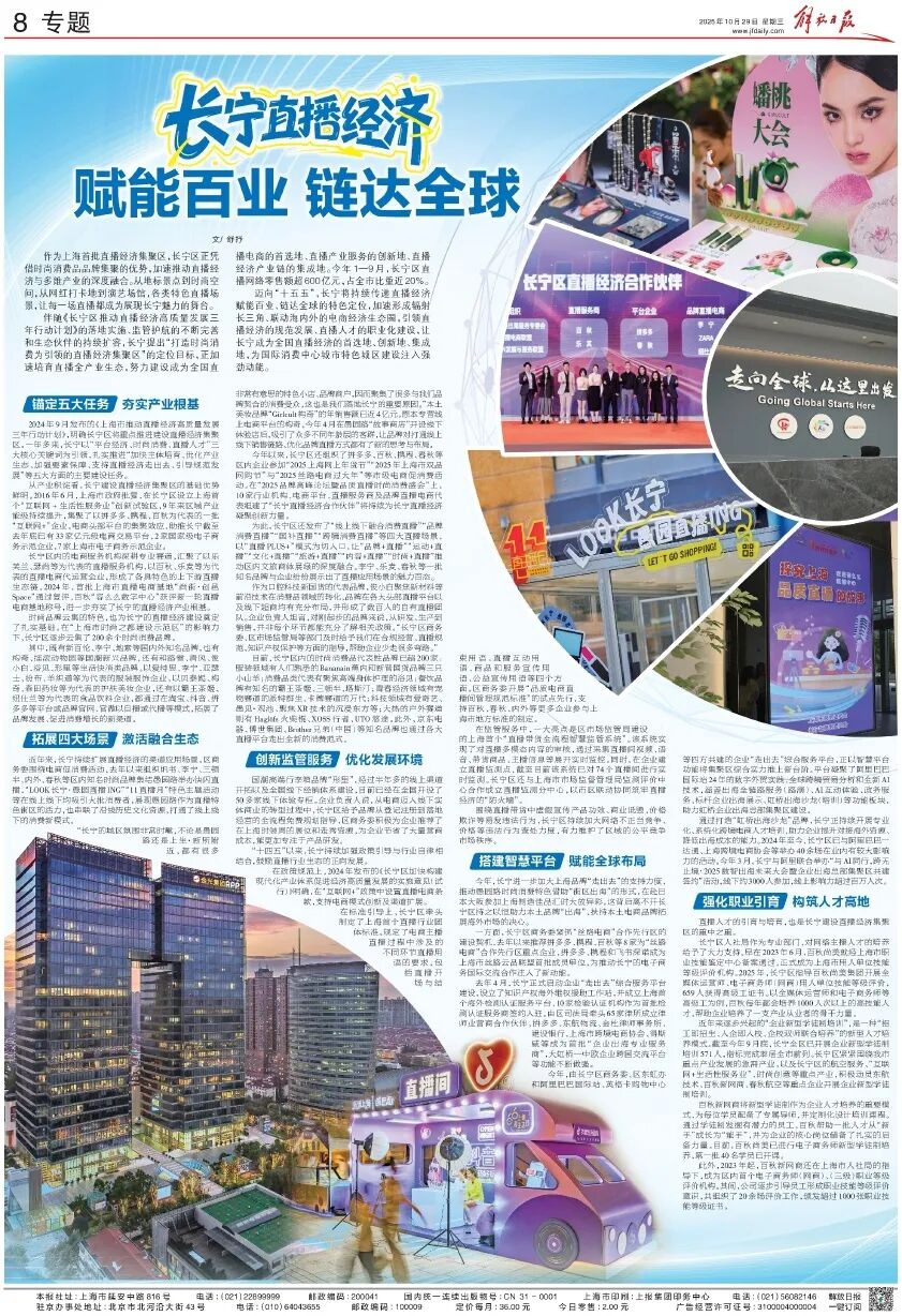 10月29日,《解放日报》专版报道:作为上海首批直播经济集聚区,长宁区正凭借时尚消费品品牌集聚的优势,加速推动直播经济与多维产业的深度融合。伴随《长宁区推动直播经济高质量发展三年行动计划》的落地实施、监管护航的不断完善和生态伙伴的持续扩容,长宁提出“打造时尚消费为引领的直播经济集聚区”的定位目标,正加速培育直播全产业生态,努力建设成为全国直播电商的首选地、直播产业服务的创新地、直播经济产业链的集成地。今年1—9月,长宁区直播网络零售额超600亿元,占全市比重近20%。