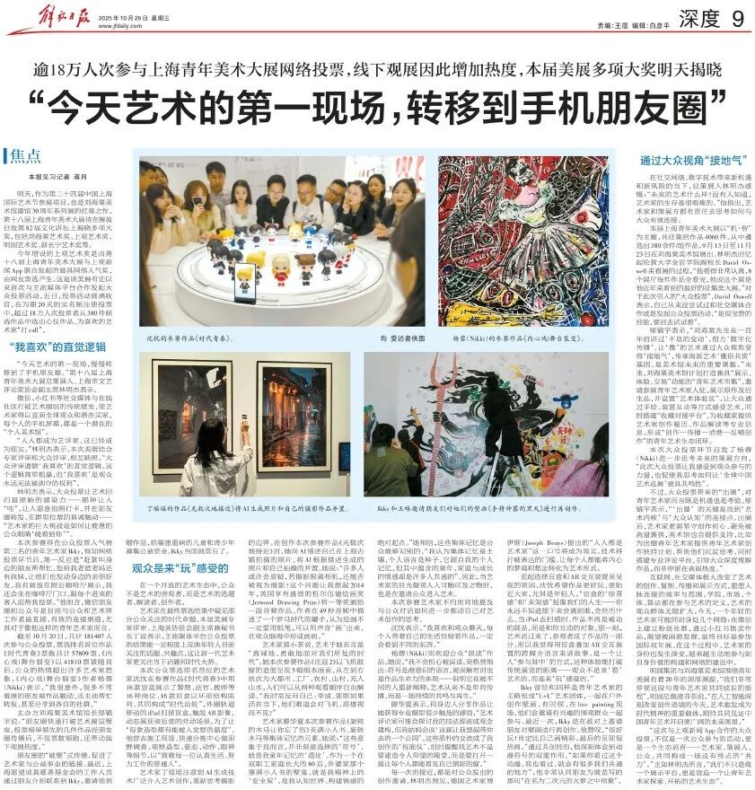 10月29日,《解放日报》、上观新闻报道:10月30日,作为第二十四届中国上海国际艺术节参展项目,也是刘海粟美术馆建馆30周年系列展的扛鼎之作,第十八届上海青年美术大展在解放日报第82届文化讲坛上揭晓多项大奖,包括刘海粟艺术奖、上观艺术奖、明园艺术奖、新长宁艺术奖等。未来,刘海粟美术馆计划打造兼具“展示、体验、交易”功能的“青年艺术市集”,同时搭建“收藏对接平台”,为收藏家提供艺术家创作履历、作品解读等专业信息,形成“创作—传播—消费—反哺创作”的青年艺术生态闭环。