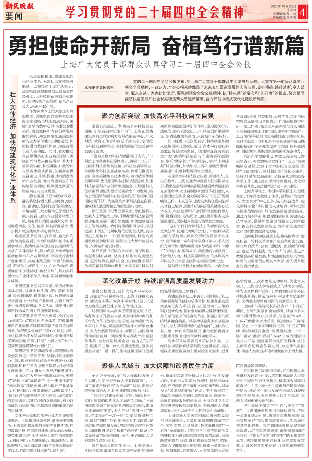 10月25日、26日,《新民晚报》要闻版、新闻综合频道“新闻报道”栏目、东方卫视“东方新闻”栏目报道:党的二十届四中全会公报发布,在上海广大党员干部群众中引发热烈反响。长宁区委书记张伟表示,将持续服务融入虹桥国际开放枢纽建设,高水平打造虹桥企业出海总部集聚区。因地制宜发展新质生产力,推动科技创新与产业焕新深度融合,依托“数字长宁”深厚积淀,深耕“上海硅巷”科创街区,加快形成主导产业强劲引领、新赛道产业蓬勃发展的生动图景。